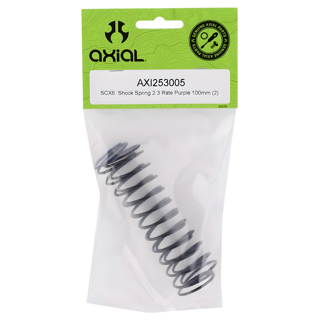Features - Designed specifically for the Axial SCX6 - 2.3 spring rate for balanced rear suspension performance - 100mm length suitable for rear shock application - Purple finish for easy identification - Ideal replacement for worn or damaged springs Specifications - Spring Rate: 2.3 - Length: 100 mm - Colour: Purple - Compatibility: Axial SCX6 rear shocks Includes - 2 x 100mm shock springs