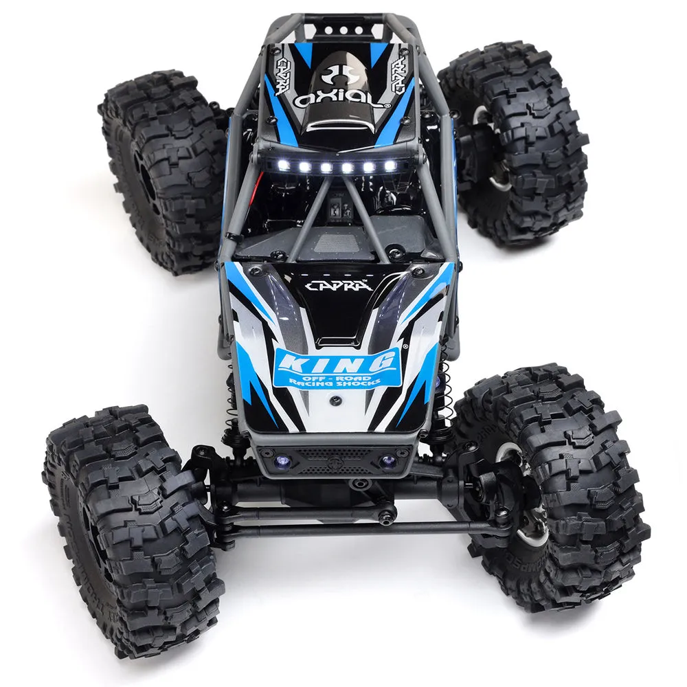 The scaled-down Capra tube chassis adds realistic trail buggy looks, with helmeted driver and passenger figures, LED headlights, rock lights, and light bar. Choose from two new paint scheme and livery options. One has a gray cage and blue body panels with licensed King Shocks livery. The other has a black cage and yellow body panels with licensed Mickey Thompson Tire livery.