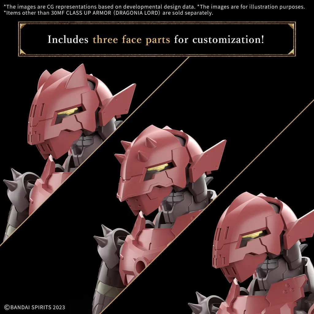 Bandai’s "30MF (30 Minutes Fantasy)" series introduces the Class Up Armor (Dragonia Lord) set — perfect for upgrading your fantasy heroes! This armor and weapon set lets you "class up" your figure to a higher-level job by using the innovative "Armor Cross" system, which replaces parts of the armor. When combined with the separately sold 30MF Dragonia Knight, you can evolve your model into the powerful Dragonia Lord! Featuring a Lightning attribute Element Core to boost your character’s elemental power, this set also includes three types of face parts for added customization, letting you tailor your Dragonia Lord’s expression and style. A fantastic way to enhance your 30MF adventures with more depth and options!
