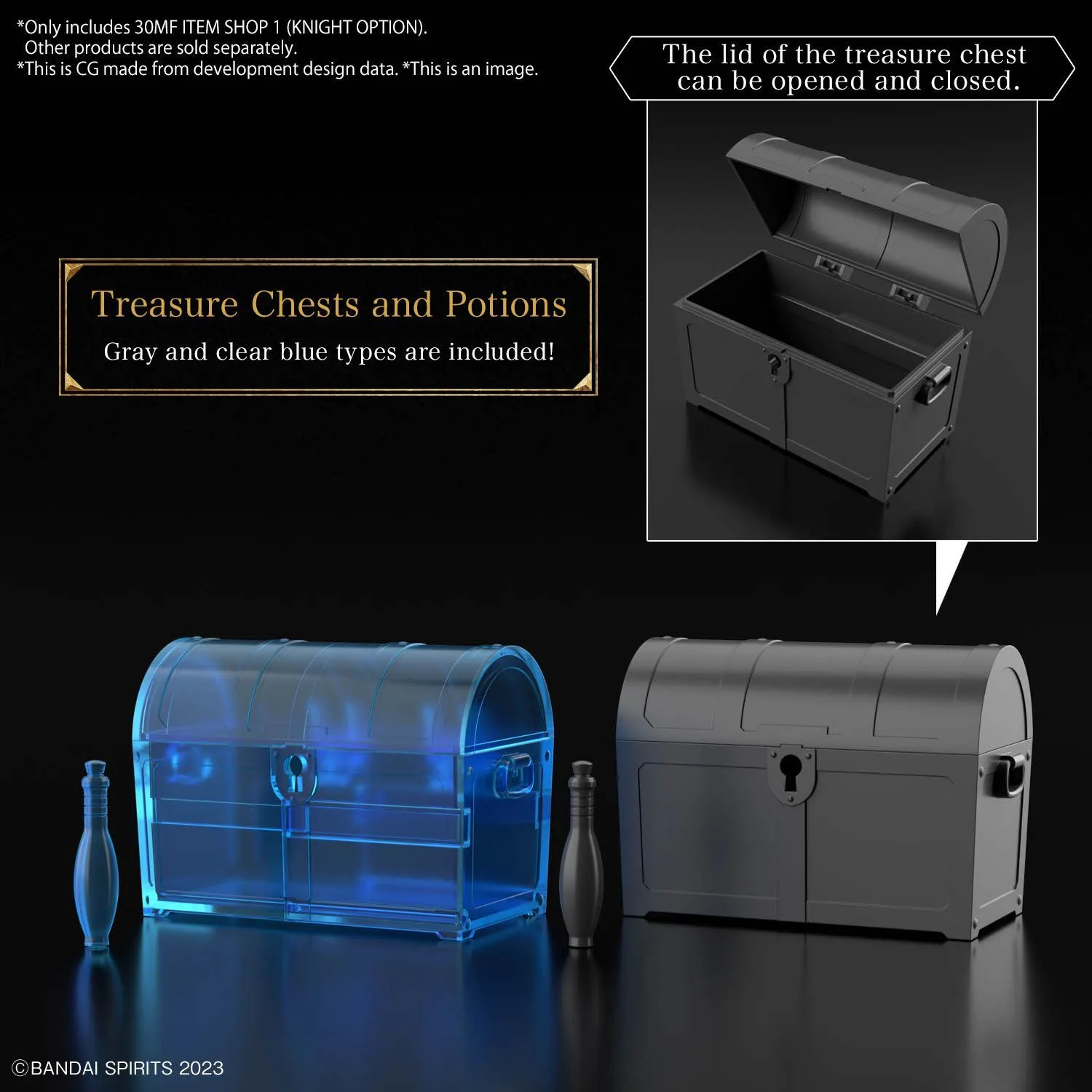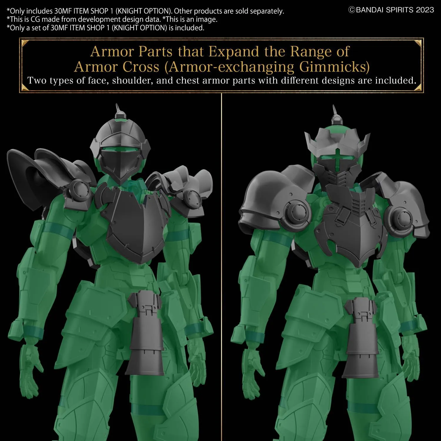 Bandai introduces the Item Shop 1: Knight Option set to their "30MF (30 Minutes Fantasy)" action figure kit line, offering expanded armor replacement and customization possibilities. This comprehensive set includes face, shoulder, and chest armor parts, each available in two distinct designs for versatile customization. A lightweight shield adds further variety to your creations. Additionally, the set features two types of treasure boxes and potions, adding realism to dioramas or displays. Included 30MS joint parts allow for seamless integration between "30MF" and "30MS" items, enabling endless combinations. With the Item Shop 1: Knight Option set, enthusiasts can expand their arsenal and embark on epic quests, enhancing their "30MF" action figure kit collection with depth and detail.