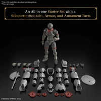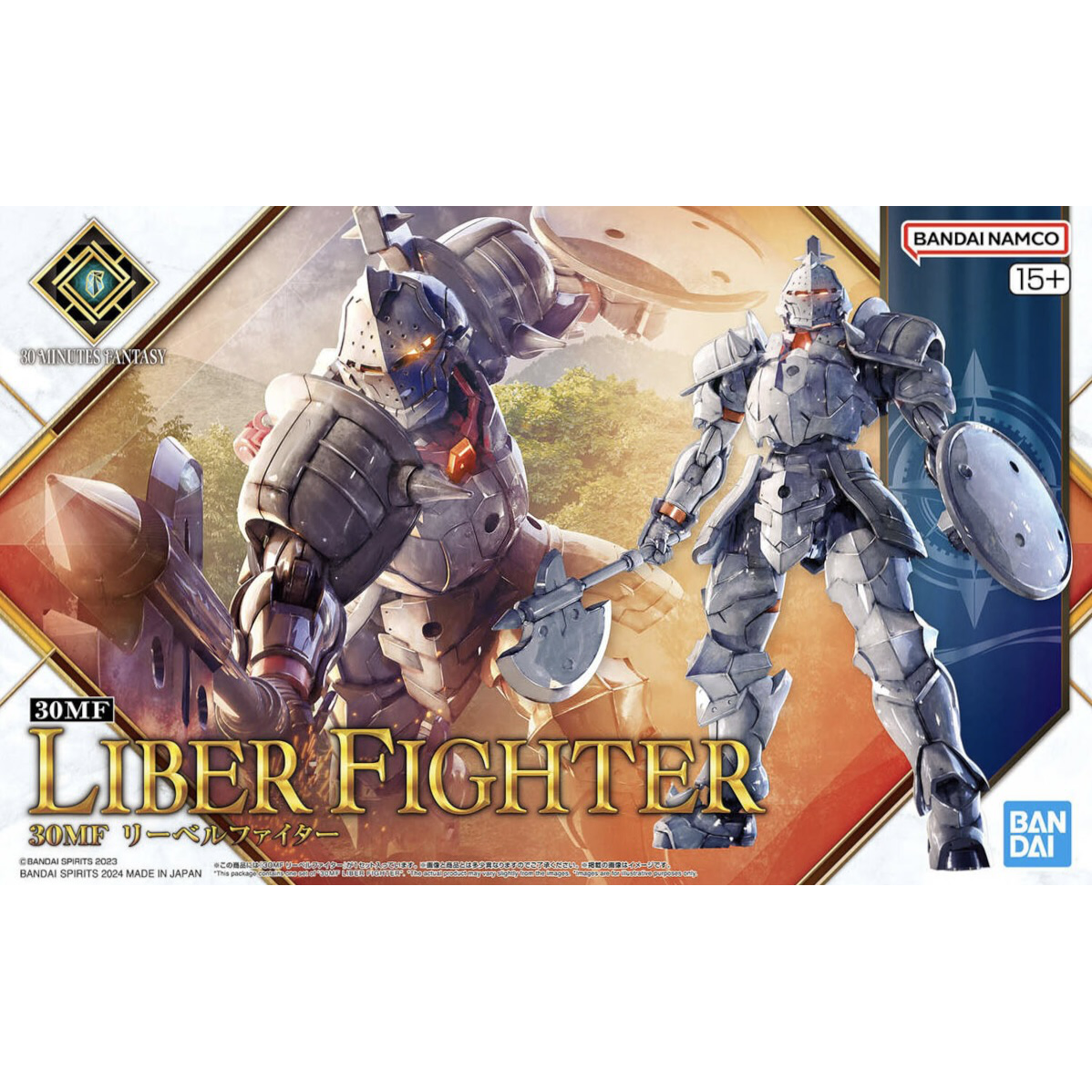 he Liber Fighter hails from Bandai's "30 Minutes Fantasy (30MF)" model-kit series, where you can create your own fantasy job! This starter set includes the base Silhouette (body) as well as armor and weapons. The Silhouette is capable of flexible human-like actions, and can be used for just about any sort of fantasy job. The head and neck have movable axes, allowing you to tuck his chin in, or stick his face out! The shoulder joints are designed with great care to keep the body line intact, even in bold poses. The movable axes on the chest, torso and waist work in conjunction with the sliding mechanism at the base of the waist joint, allowing for natural poses. The Silhouette has a more substantial form than the separately sold Liber Knight.