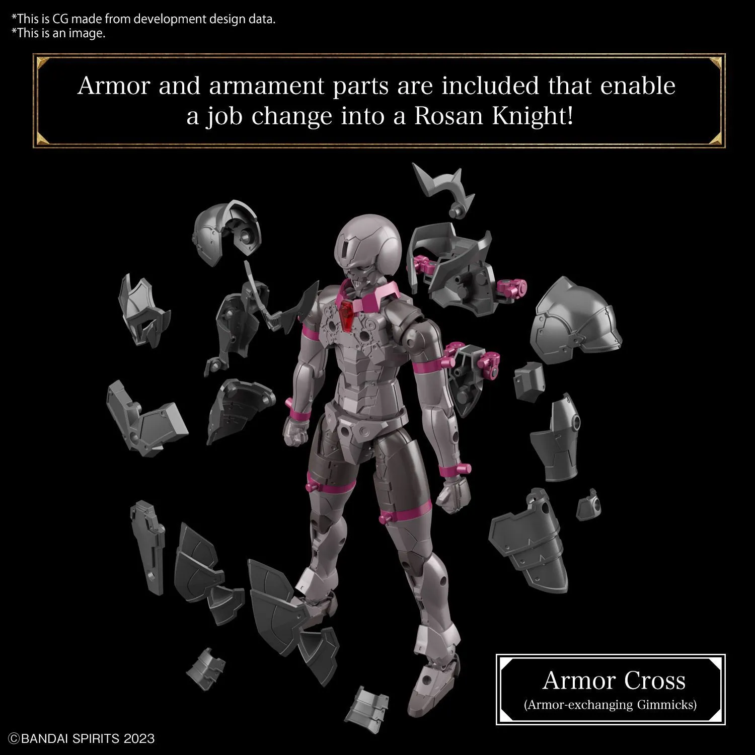 Bandai's new figure-kit series, "30MF (30 Minutes Fantasy)," debuts with the Rozen Knight! This new lineup allows you to create your own fantasy-based figures and characters! Features - In addition to the base "silhouette" [body], a starter set that includes armor and weapon parts. - "Silhouette" [body] is capable of human-like flexible actions and can be adapted to any job. - By providing movable shafts on the head and neck, it is possible to pull the chin and protrude the face. - The new structure of the shoulder joint prevents the line of the body from collapsing even in bold poses. - The movable axis of the chest, torso, and waist and the sliding mechanism at the base of the waist joint work together to achieve a natural pose. - Armor and armament parts are included to "change jobs" to "Roseann Knight" by combining it with "Silhouette" [Body]. - Flexible movement is achieved by using a new mechanism to attach shoulder and waist armor via the joints on the back. - Swords and shields can be mounted on the back and waist by using joint parts. - The attribute of the element core is "fire". - Face design and coloring different from the "Silhouette" and "Knight" of the Republic of Liber, which are sold separately.