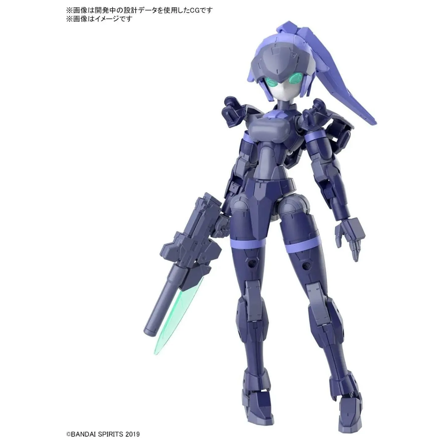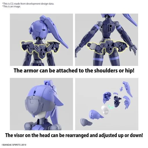 Introducing the Acerby (Type-B) model kit from Bandai's "30Minutes Missions" (30MM) series,This comprehensive kit includes the main body, armor parts, and an assortment of weapons.The armor pieces can be securely attached to the shoulders and waist of the model, allowing for a streamlined and formidable appearance. The submachine gun comes equipped with a detachable beam sword, providing additional versatility in combat situations.To further enhance the customization options, the visor on the head can be adjusted up and down by simply replacing it. Additionally, the kit includes chest parts that enable the customization of the armor that accompanies the Spinatia.