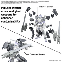 Other figures shown not included (sold separately) 1/144 Scale Made of plastic Part of the 30 Minutes Missions series Compatible with most 30MM model kits Instructions may or may not include English translation Contents Pieces to build Backpack set Armor set 2 Cannon Blades Joint parts set Instructions