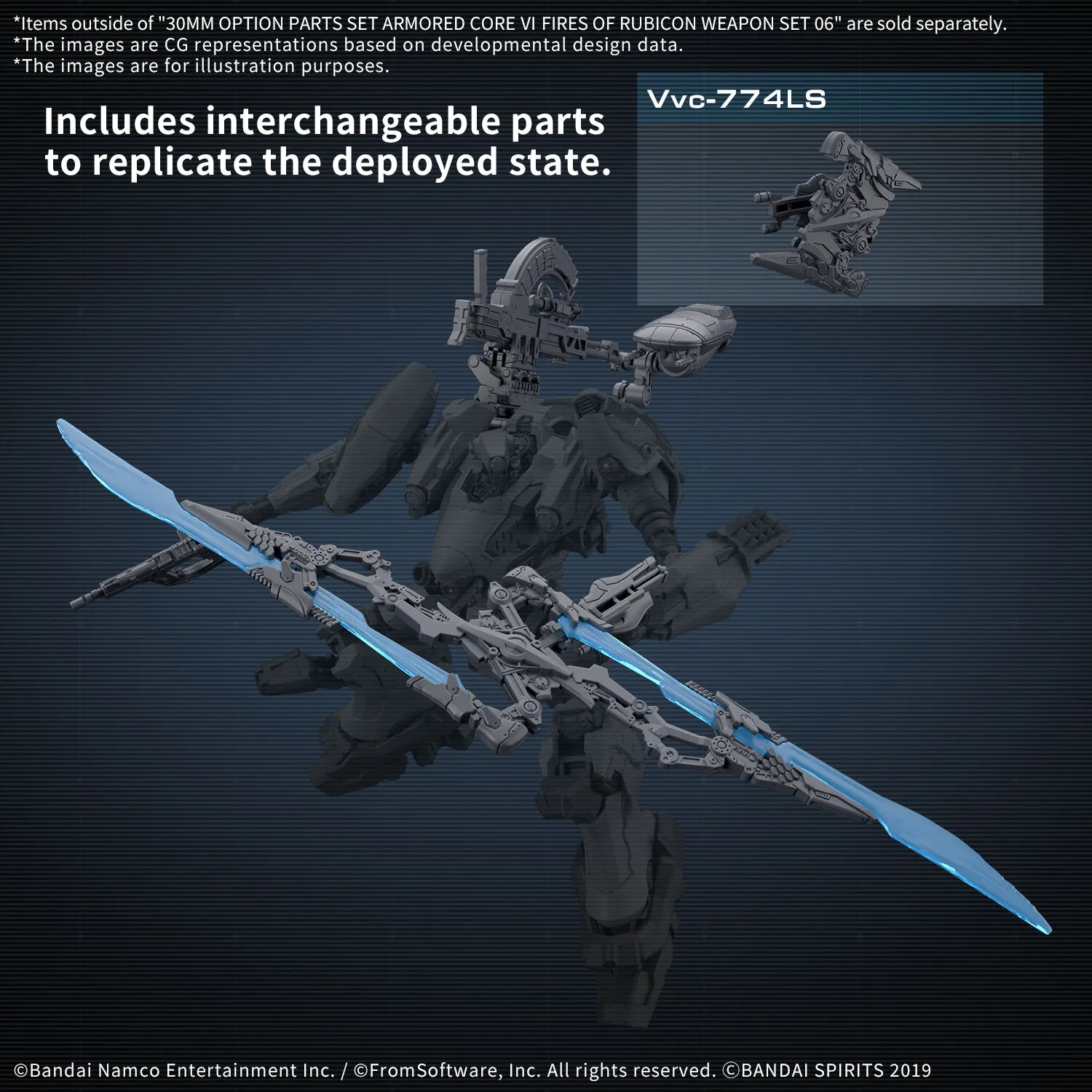 Items from Armored Core VI: Fires of Rubicon are now part of Bandai's "30MM (30 Minutes Missions)" lineup! Staying true to the series' core concepts of simple assembly and customization, you can now add a set of weapons, including the laser slicer with its iconic double-edged blade, to your collection! - The kit includes weapons such as the MA-E-211 SAMPU, Vvc-774LS, Vvc-703PM, and MA-J-200 RANSETSU-RF. - Weapons that change shape depending on whether they are equipped on the left or right come with reproduction parts, allowing you to choose which side to assemble them on. - Interchangeable parts are included to recreate the Vvc-774LS in its deployed state. - Left and right weapon hangers are included, allowing arm weapons to be equipped on the shoulders.