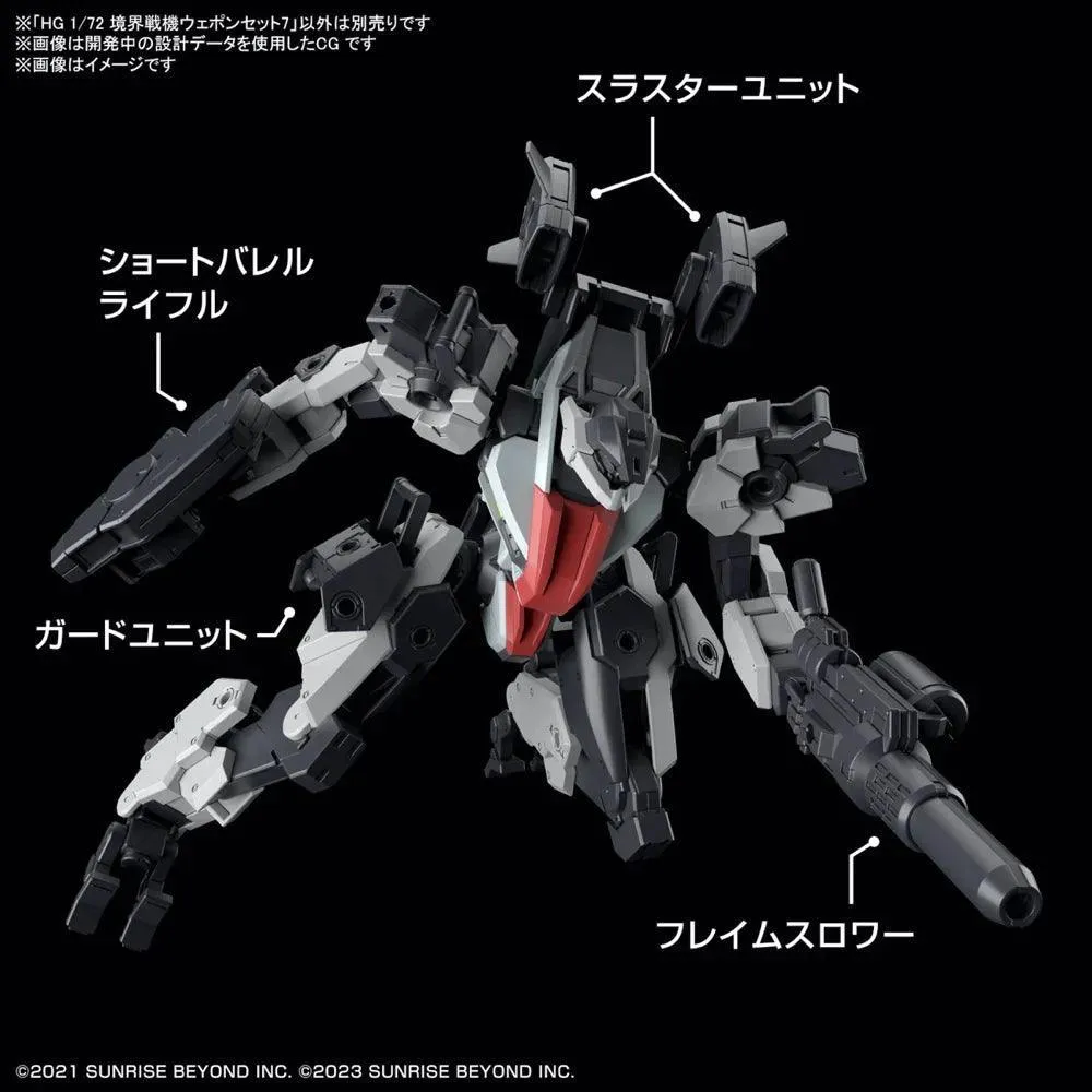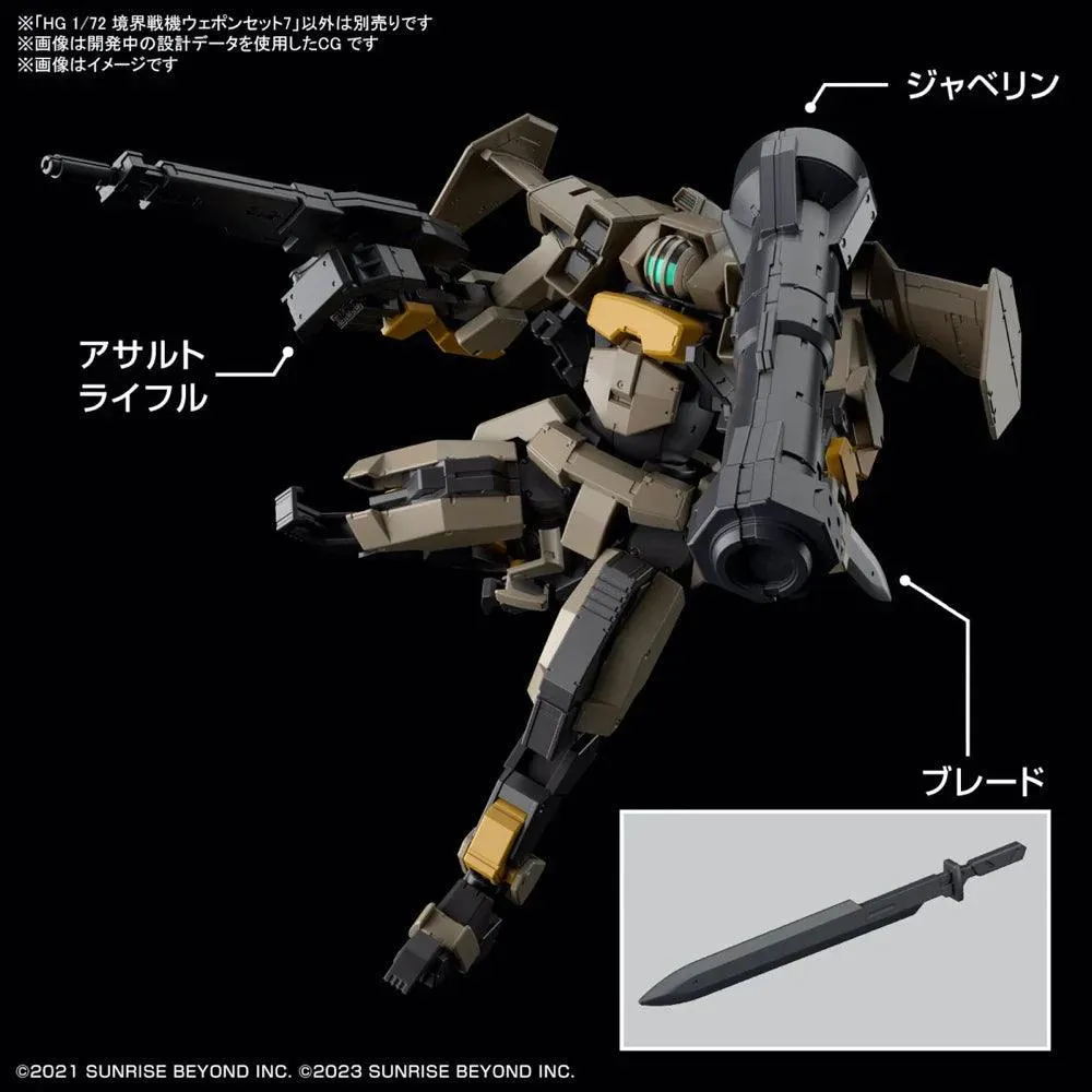 Introducing a new High Grade (HG) set of weapons designed specifically for your "Kyoukai Senki" model kits! Enhance the firepower and versatility of your Bandai 1/72-scale "Kyoukai Senki" MAILeS mecha by combining them with these exciting new armaments. This HG weapon set offers a wide range of options to customize your mecha's loadout. Arm your model kits with an assortment of powerful weapons, including cannons, missile launchers, energy blades, and more. These weapons are designed to fit seamlessly with the "Kyoukai Senki" series, ensuring a perfect match in terms of scale and aesthetic.