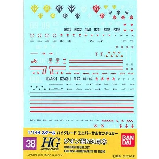 GUNDAM DECAL 38 HGUC ZEON 3 The Gundam Decal No.38 HGUC Zeon MS No.3 set comes with decals to decorate your Mobile Suit Gundam 1/144 scale models.