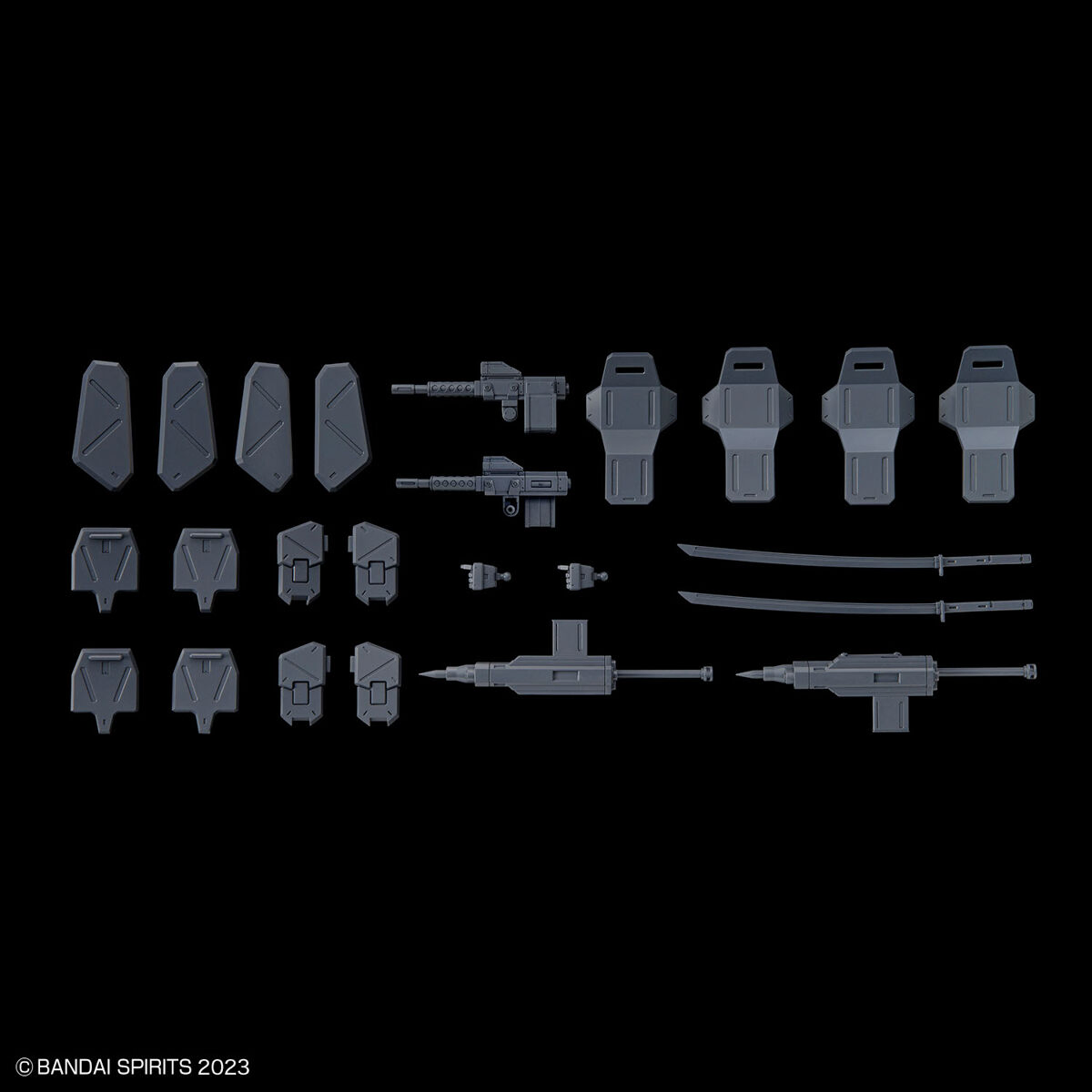 This supplementary weaponry set enables you to enhance the firepower of your "Kyoukai Senki" model kits! It comprises an assortment of armament and armor components, including a super heat swing combat curved sword and a 180mm back-suspended automatic grenade gun. The stake section of the 200mm combat pile injection machine can be slid, allowing the injection mode to be recreated without requiring parts replacement. An additional left hand designed for holding weapons is also included.