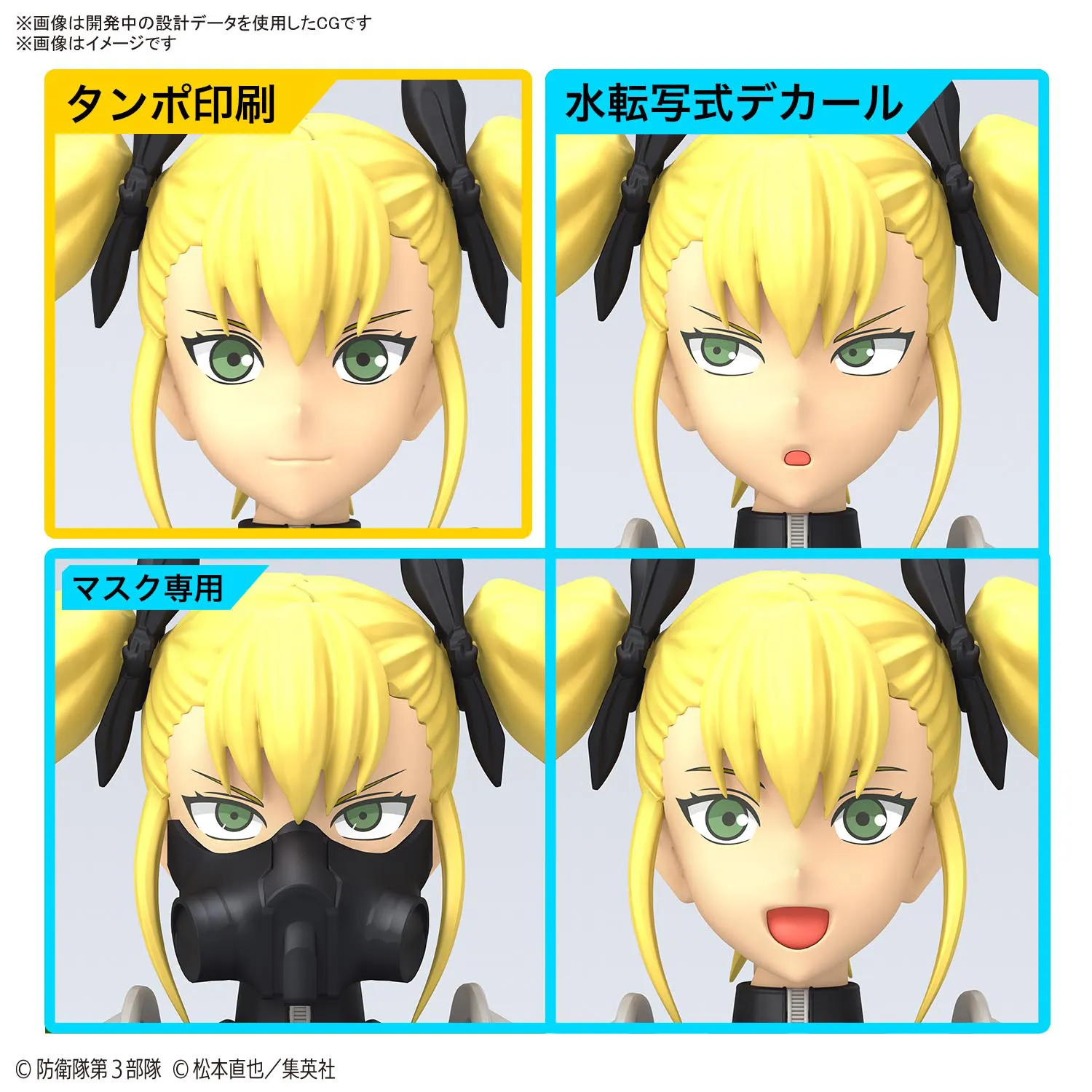 Shinomiya Kikoru from "Kaiju No. 8," the hotly anticipated new anime that starts airing in April 2024, now joins the "Figure-Rise Standard" action figure model kit series from Bandai! This action-packed figure takes advantage of her rich armaments and slender form! Four facial expressions are included -- one with tampo printing and three with waterslide decals, including one wearing a mask. In addition to a handgun and basic gun, a huge axe is included as well. By making full use of her extensive jointing, she can get into all kinds of supple and dynamic poses that don't disrupt her body line. Remove the back part to expose a joint hole for an action base (not included)! Interchangeable hands are also included.