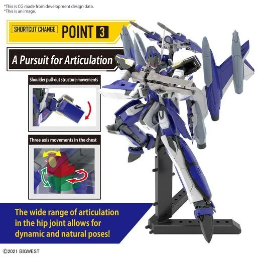 Bandai proudly presents the full set High Grade (HG) model kit of Maximilian Jenius's custom YF-29 Durandal Valkyrie, as featured in the electrifying "Macross Delta Zettai LIVE!!!!!!" series! This kit includes the highly anticipated super parts, delivering an unparalleled building and posing experience.Taking advantage of the HG series' user-friendly assembly and exceptional articulation, this kit incorporates the innovative "Shortcut Change" system. By utilizing replacement parts, the transformation sequence of the YF-29 Durandal Valkyrie is simplified, ensuring a smoother and more enjoyable building process. The super parts of the model kit can be effortlessly attached or detached, providing options for customization and display. Additionally, the missile hatch and fold wave projector development are accurately replicated through parts replacement, capturing the intricate details of the original design. The booster nozzle features a telescopic gimmick, enhancing the model's dynamic appearance. The elegant curvature of the forward wings in Fighter Mode is faithfully recreated, as well as the distinctive silhouette in Gerwalk Mode. The Battroid Mode showcases its characteristic sleek bodyline, capturing the essence of the YF-29 Durandal Valkyrie. To offer enhanced poseability, the range of motion for the arms is expanded with pull-out joints in the shoulders. Furthermore, a triple-axis joint is added to the chest, while the hip joint provides a wide range of motion, enabling dynamic and natural posing possibilities. The clear parts of the kit are crafted with polarization molding in three colors, creating a captivating visual effect that changes depending on the angle of light.