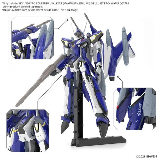 This set of decals was made especially for Bandai's 1/100 HG YF-29 Durandal Valkyrie (Maximilian Genus Custom) Full Set Pack model kit! Decals are included for all three forms: Battroid, Gerwalk and Fighter.