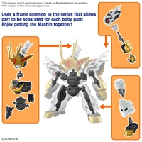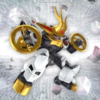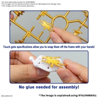 The kit uses a frame common to the series, and the parts can be removed from the runners by hand -- no tools required, and these kits also assemble without the need for glue! The chakram-type weapons can be attached to its back, and the head and weapons are reproduced in a gleaming metallic golden color.