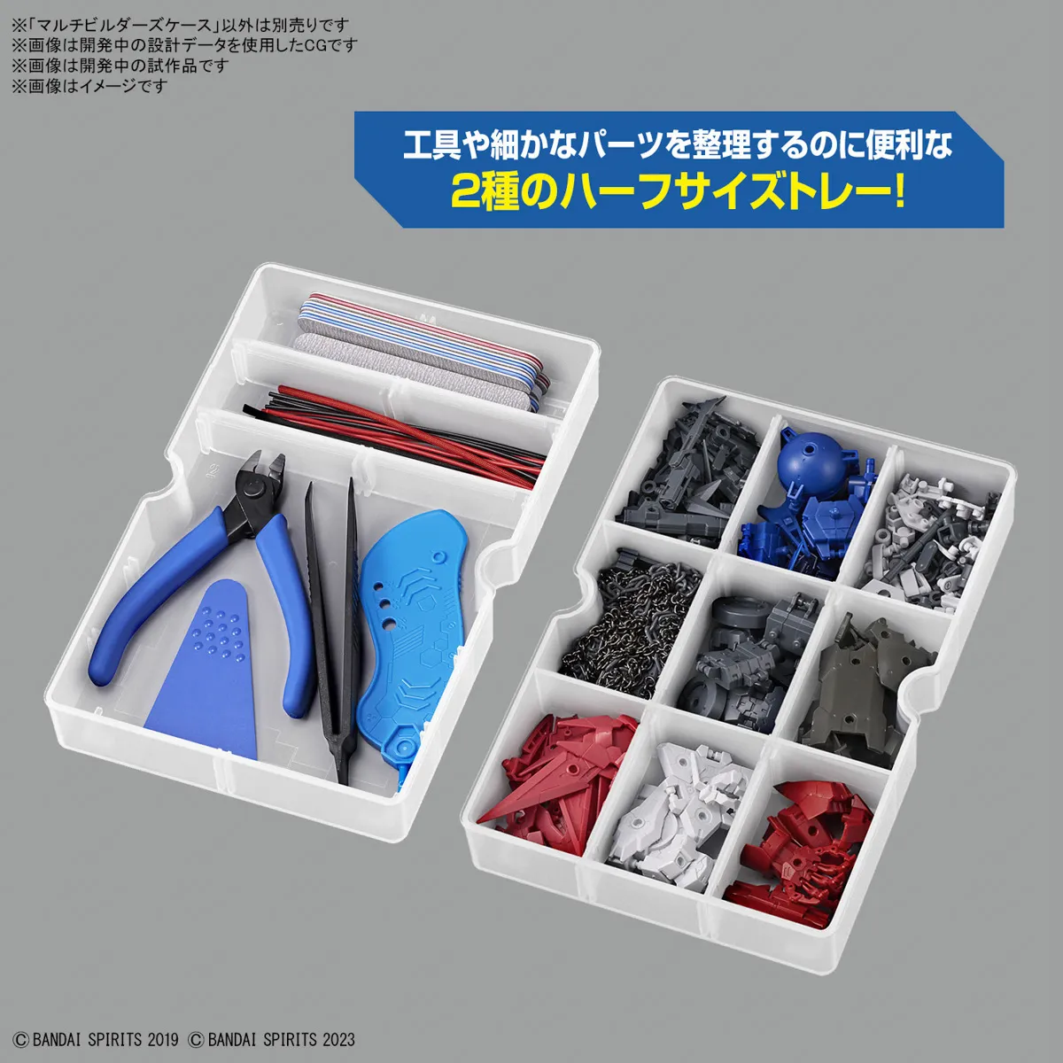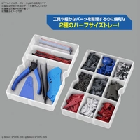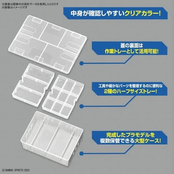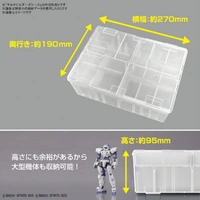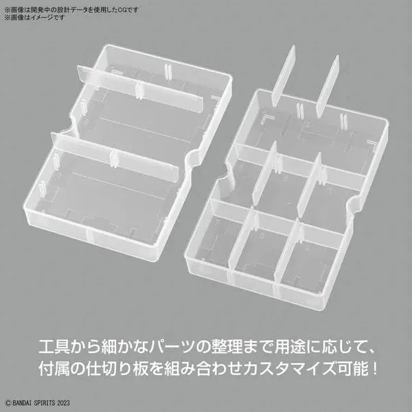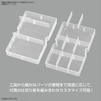 SKU: G5065632 | Brand: Bandai | Product: Bandai Multi Builders Case The Bandai Multi Builders Case [G5065632] organizes plastic model components, tools, and supplies with transparent walls for quick inventory viewing. Non-slip surface grooves prevent shifting during transport and storage. Adjustable partition plates accommodate various storage configurations, keeping completed models securely separated. Two integrated half-tray designs organize small parts and tools efficiently. The case lid's interior surface functions as a work tray, and multiple units stack for expanded capacity. - Dimensions: 27 x 19 x 9.5 cm - Weight: 0.5000kg Includes: - Storage case - Partition plates (x1 set)