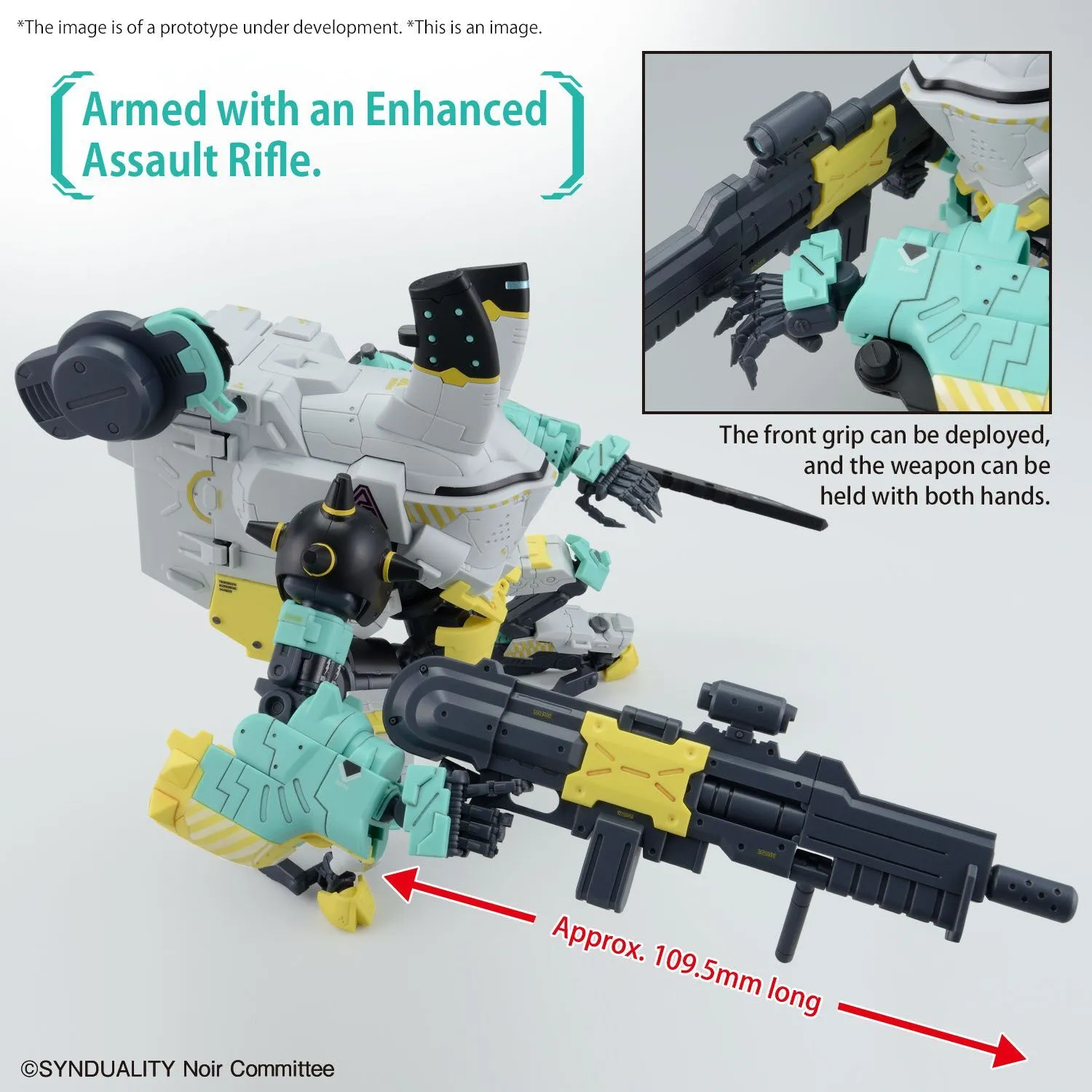 Bandai introduces the Daisy Ogre Alter, an upgraded version of the Daisy Ogre mecha from the anime "Synduality Noir." This model kit includes new weaponry like the Gamilant Blade, Saw Launcher, and an extended assault rifle. The assault rifle can be used with two hands thanks to its expandable front grip. The Gamilant Blade can be displayed in both deployed and stowed positions, and the Saw Launcher has a rotatable blade that can be detached and displayed separately. The cockpit and coffin components are highly detailed with sliding and opening features. The kit also includes mini figures of the main characters, Kanata and Noir, and offers options to change the leg design for various poses. Stickers are provided for additional customization.