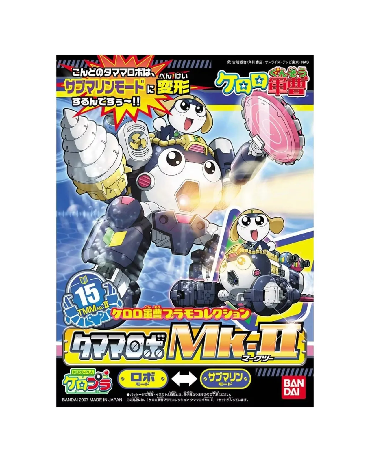 Tamama Robo Mk.II is transformable from robot mode to submarine mode, and can be combined with the other four Keroro Platoon members' Mk.II robots (sold seperately) to form God Keron!