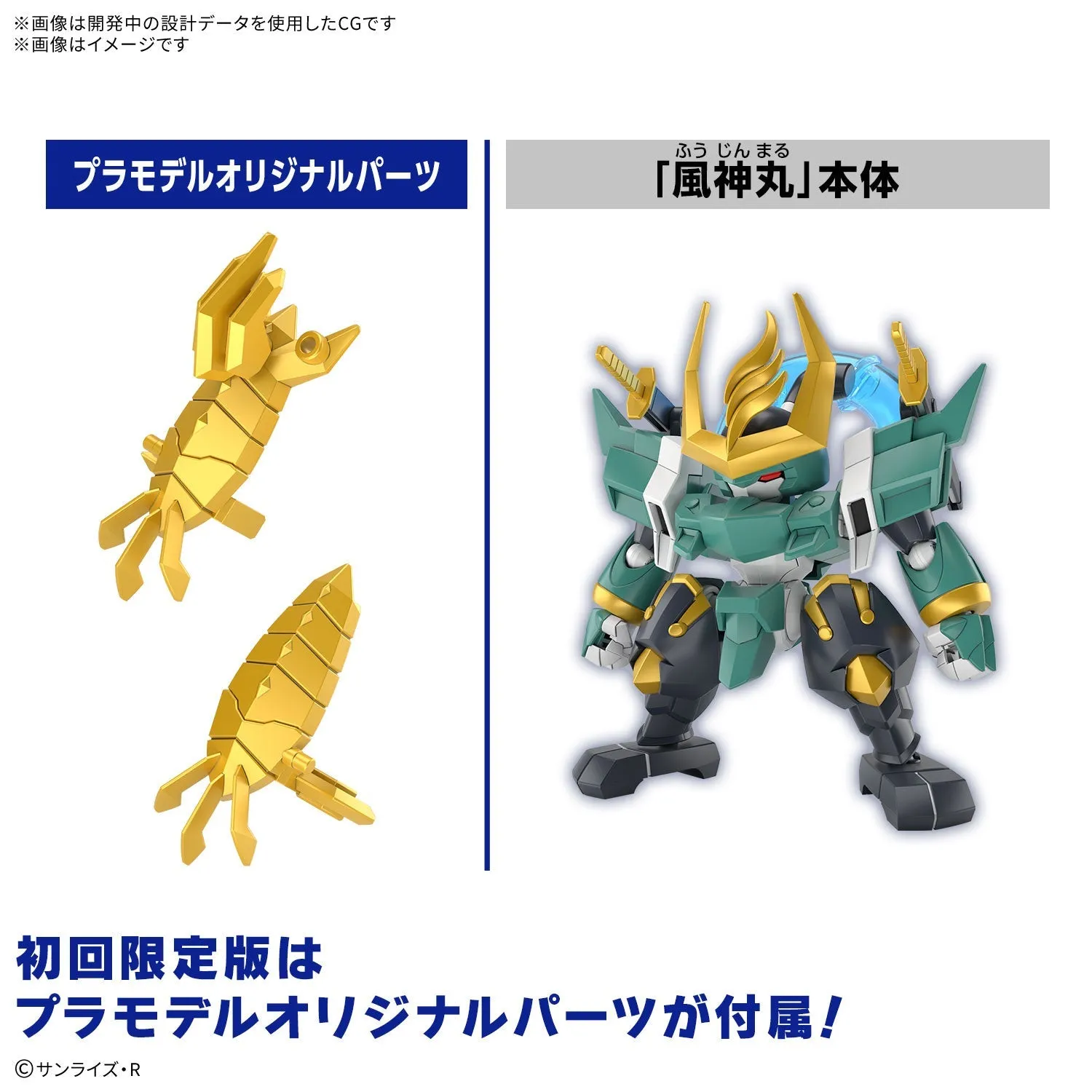A new "Mashin Hero Wataru" TV anime is in production, and to celebrate, Bandai brings us a limited-edition model kit of Fujinmaru! The kit uses a frame common to the series, and the parts can be removed from the runners by hand -- no tools required, and these kits also assemble without the need for glue! The sword can be stored in the sheath, and the sheath can be attached to the back; the head and other parts are reproduced in a gleaming metallic golden color.