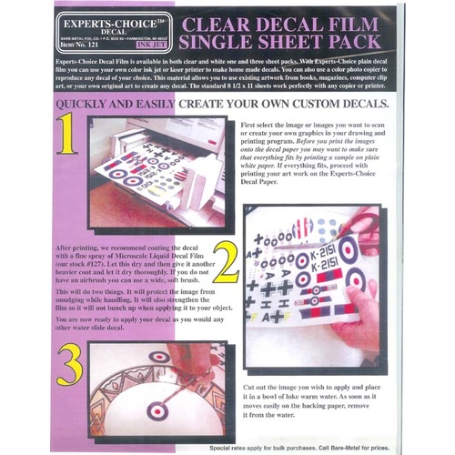 Experts-Choice Decal Film is available in both clear and white one and three sheet packs. With Experts-Choice plain decal film you can use your own color ink jet or laser printer to make home made decals. You can also use a color photo copier to reproduce any decal of your choice. This material allows you to use existing artwork from books, magazines, computer clip art, or your own original art to create any decal.
