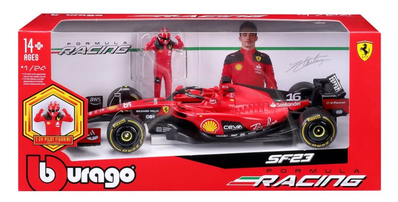 Bburago 1/24 2023 Ferrari SF23 with Leclerc Driver Figurine #16 in WB