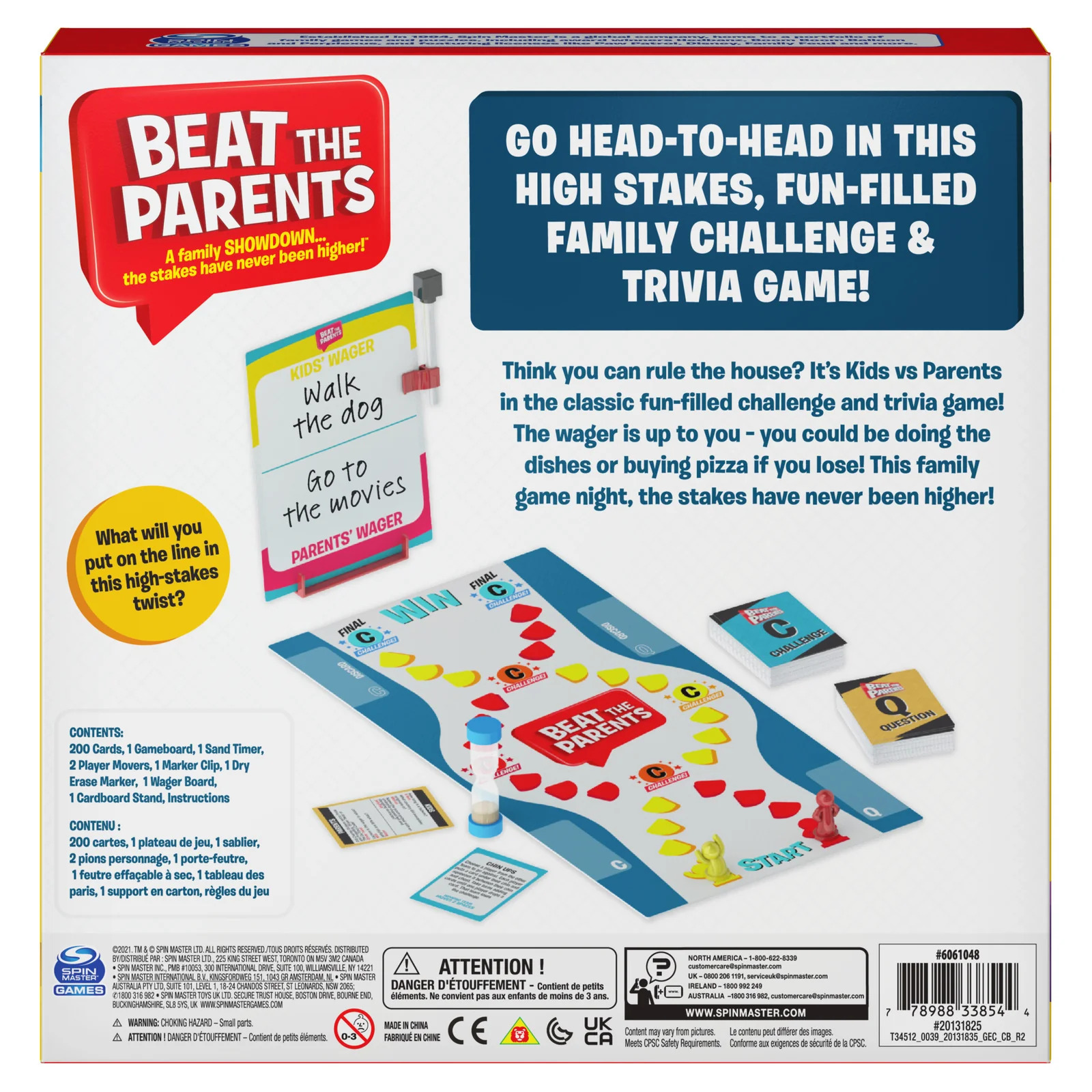 • WHO RULES THE HOUSE? In Beat the Parents, it’s kids vs parents in a fun-filled, action-packed showdown of trivia and challenges. There’s a wager at stake – will your team be champions on family game night?