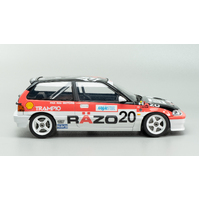 This new-mold model kit from Beemax reproduces the Honda Civic EF3 that took part in the 1989 Macau Gear Race! The hatchback body style is fully reproduced; the interior and roll cage are also highly detailed, as is the underside of the chassis and suspension.