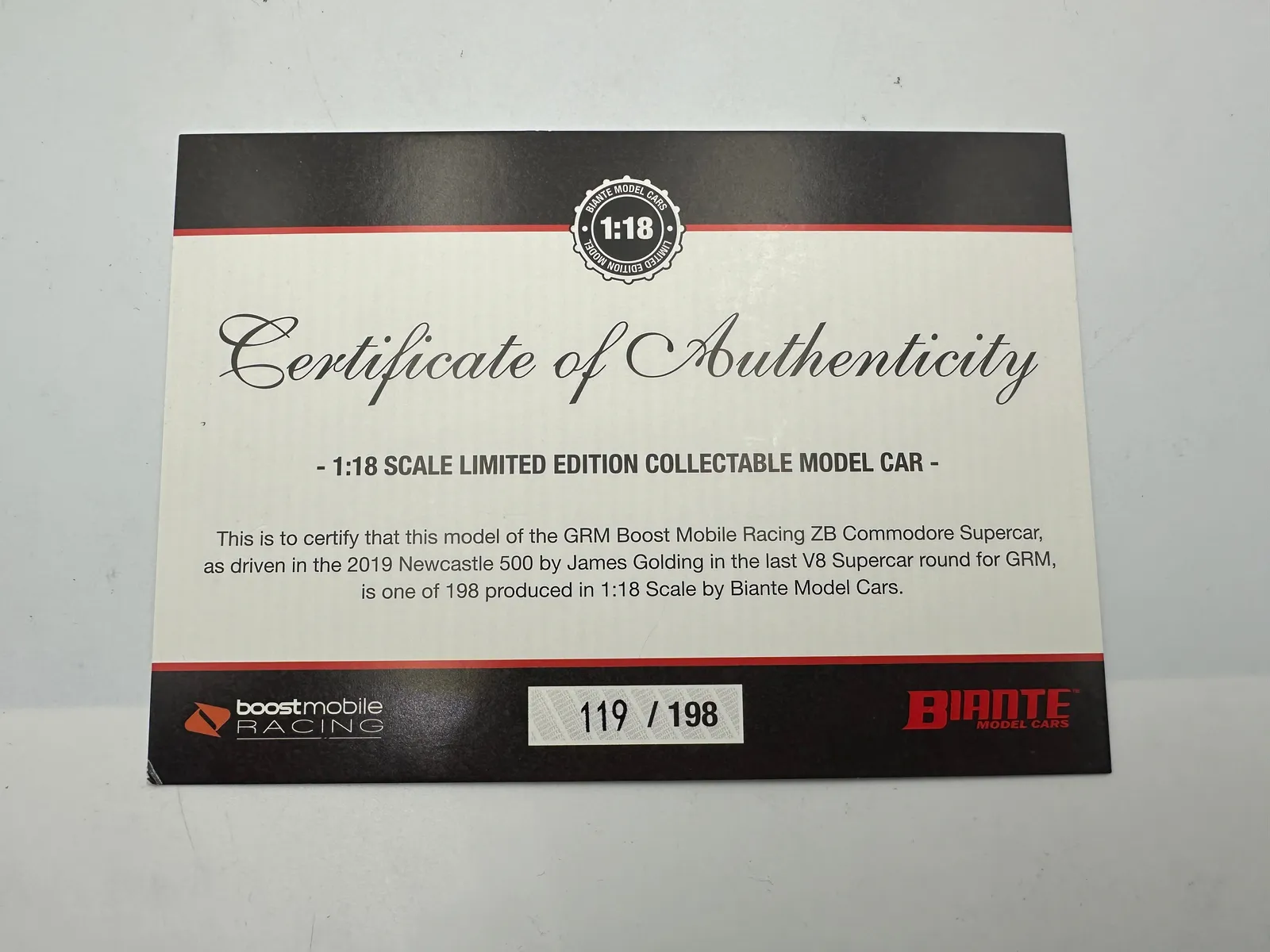 Biante 1/18 Holden ZB Commodore - Garry Rogers Motorsport - #34 - GOLDING - Newcastle - Last GRM V8 Supercar Race Diecast Car