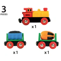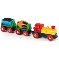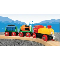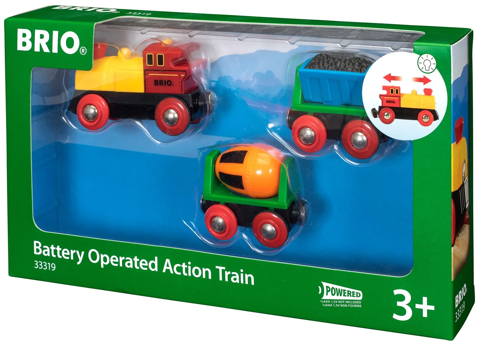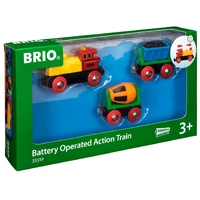 If you're looking for a new set of wheels for your BRIO train track, you're in the right place. This battery operated action train set is extra fun with a moving coal wagon and a rotating cement mixer as well as headlights that light up on the engine.