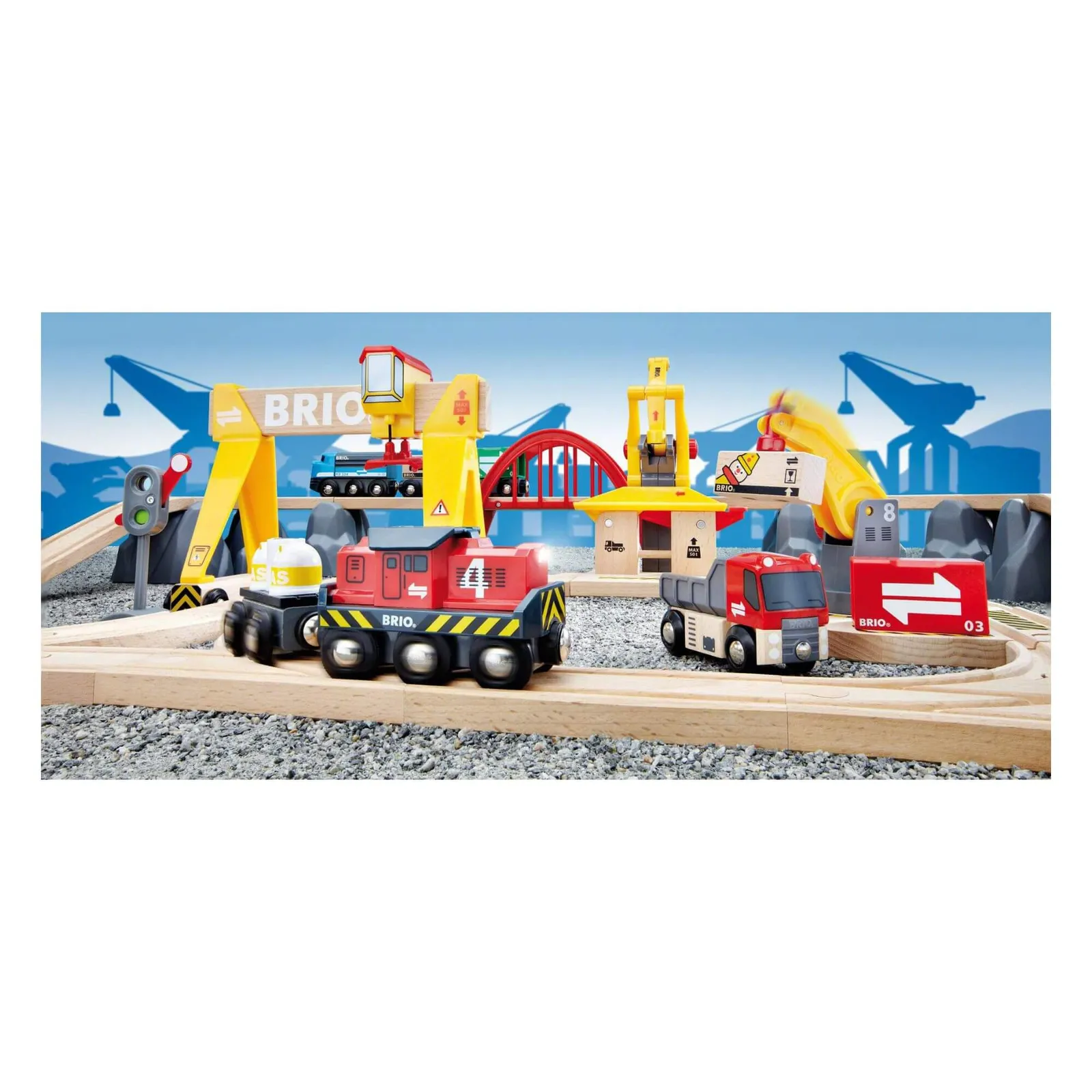 BRIO Cargo Railway Deluxe Set – 54 Piece Wooden Train Set (33097) Big adventures are waiting with the BRIO Cargo Railway Deluxe Set ! This action-packed 54-piece wooden train set includes cranes, bridges, a battery-powered engine, and more – perfect for kids who love trains and hands-on play. Features: Battery-powered freight engine: With working headlights and simple controls, kids can move their train forward, stop, or reverse with ease. Interactive cranes: Use the magnetic gantry crane and low-level crane to lift and load cargo from trains to trucks. Suspension bridge & elevated track: Build exciting layouts with bridges and raised tracks for dynamic cargo delivery play. Freight goods station: Drop cargo into the tipper truck using the mechanical ramp and magnetic arm – just press the button to release. Durable & eco-friendly: Made from FSC-certified beech wood and high-quality plastic, suitable for children aged 3 and up. What’s Included: 1x Battery-powered Freight Engine with Lights 1x Gantry Crane with Magnet Hook 1x Freight Goods Station with Ramp 1x Low-Level Crane 1x Tipper Truck 1x Red Suspension Bridge Assorted Wooden Tracks, Cargo Pieces, and Accessories (54 pieces total) Product Specifications: Recommended Age: 3+ years SKU: BRI33097 Dimensions: 16.5 x 38.4 x 28.9 cm Weight: 3.11 kg Compatibility: Fully compatible with all BRIO World railway sets Why Buy from Online Toys Australia? At Online Toys Australia , we bring you trusted brands like BRIO to inspire creativity and learning through play.Suitable for children aged 3 years +