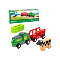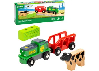 ake the animals out to pasture with the 36018 Farm Battery Engine. Designed with toddlers in mind, this battery-operated toy train features a simple tap and go function for frustration-free play. Just push down on the front of the engine to start moving, then bring it to a stop by pushing down again. Place either the wooden cow or wooden hay load into the wagon and attach it to the toy train using the classic BRIO magnetic connectors before setting off.