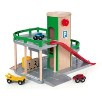 Bring the world of rail and road together in this unique parking garage. With multiple levels of fun you can drive to the top and park, take the chute down or fuel up on level 1. You could also place the car on the ramp on level 2, press the button and see how the car falls onto the car transporter wagon below on the railway track. This item includes: - 1x Garage - 2x Cars - 1x Trailer - 2x Train Track Ramps - 1x Road Ramp Measures 37 x 27.4 x 27cm BRIO Trains, Engines, Wagons, Carriages, and Vehicles feature the classic BRIO magnetic couplingsfor easily hook up! All train sets, rails, accessories and destinations feature the classic wooden train track allowing for easy connection to each other and expand your own BRIO World. Crafted using FSC sourced European beech wood and high-quality plastics the BRIO World railway range is suitable for ages 3 Years and up and make ideal gifts for boys and great gifts for girls. We know that children sometimes play with toys in other ways than expected. That’s why we test our products thoroughly to our strict safety requirements which in many cases are tougher than the legal requirements. BRIO Railway Sets make a great birthday gift or smashing Christmas gift. On the second level, you can use the spring-loaded trapdoor to load cars onto the car transporter wagon. Or ride all the way to the top level and zoom down the high-speed ramp instead. Rails & roads: The Parking Garage is connected to the BRIO World via both railway and road connections on the first level. Also included are 3 ramp tracks for more open-ended play – 2 for the railway connections and 1 for the road connection. Part of the BRIO World: The Parking Garage is fully compatible with other BRIO World sets, tracks and trains. The 2 colourful cars and car transporter wagon all feature the classic BRIO magnetic couplings allowing for easy connection to each other and other vehicles. No warnings required.