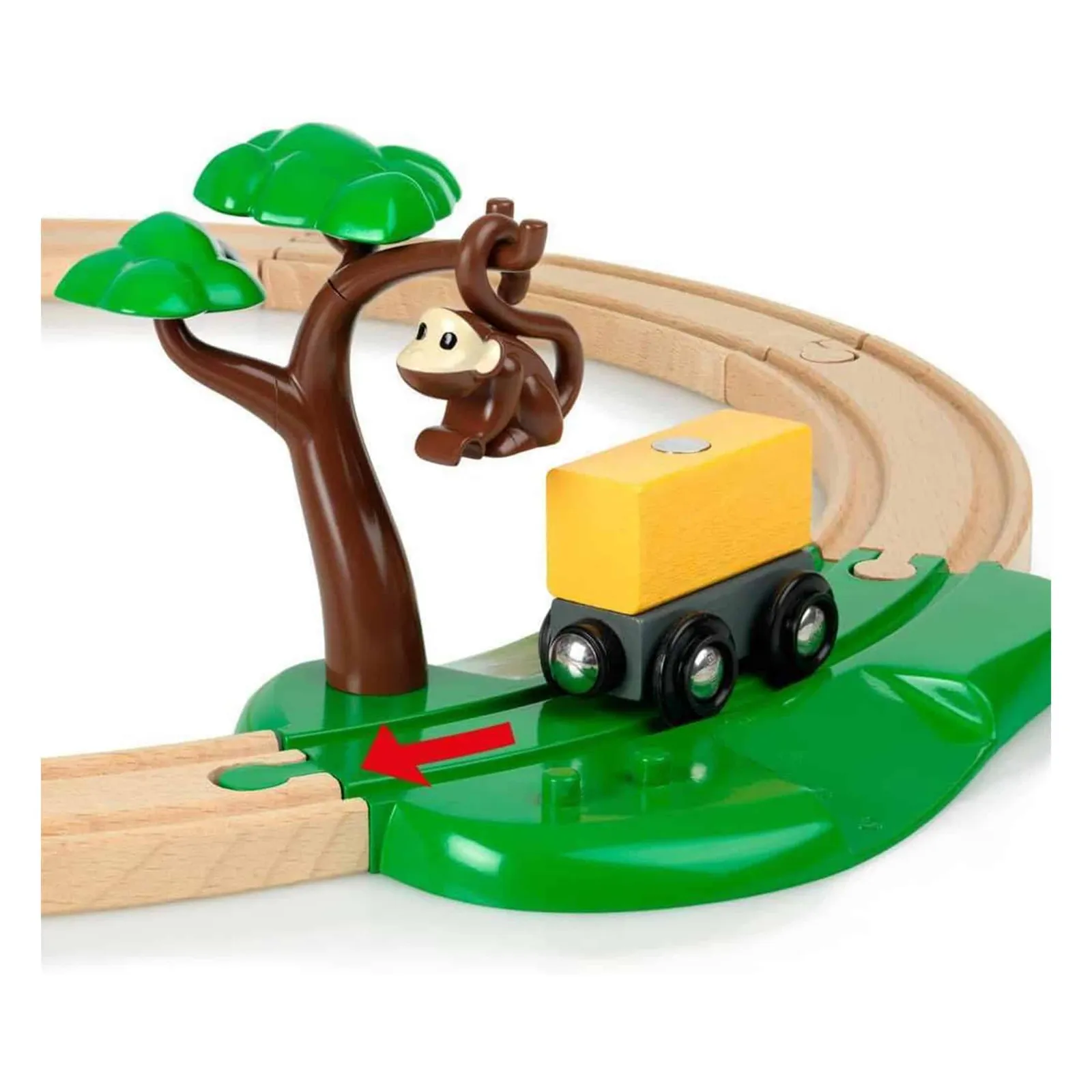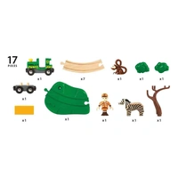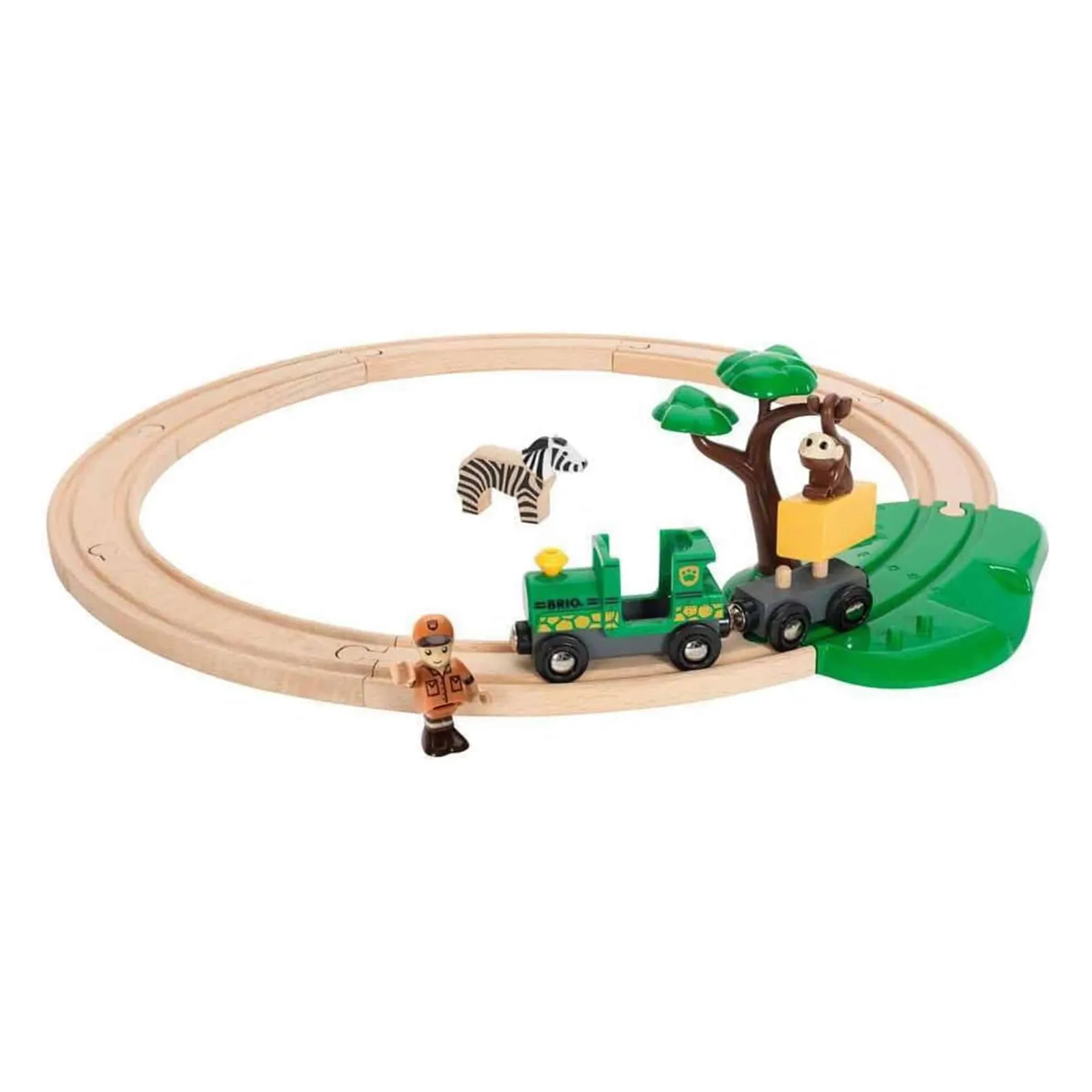 Come along on a safari train adventure and spot the zebra out on the savannah. Watch out for the mischievous monkey who likes to steal the magnetic food load right off the toy train when you pass by! The BRIO safari railway set Includes a safari ranger figure and an engine to help deliver the goods. Safari toys are fun!