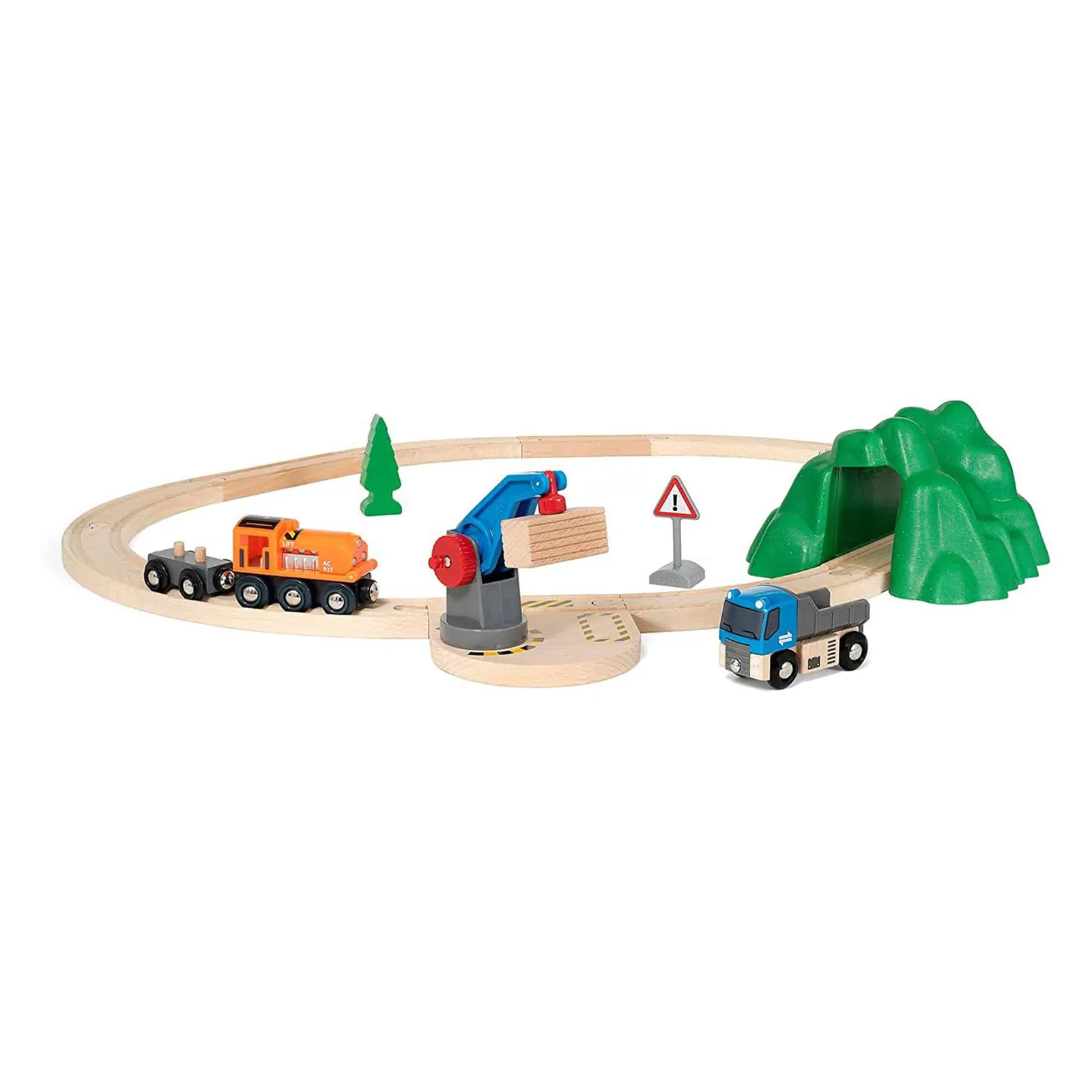 Let’s dive into the details: Engine : The heart of the railway, this little engine chugs along, ready to transport goods and excitement. Lorry : A sturdy vehicle that can carry cargo on the road or connect with the train for seamless transportation. Wagon : Attach this wagon to the engine or lorry, and it becomes a vital part of the freight train. Wooden Load : A chunky wooden cargo piece, waiting to be lifted and loaded onto the train. Hill : A gentle incline where the train can climb, adding a touch of realism to your railway world. Crane : The star of the show! Use the crane to lift the wooden load, swing it around, and place it onto the wagon. Tree : A charming wooden tree to decorate the landscape – because every railway needs a touch of greenery. Sign : Safety first! Place the warning sign near the tracks to alert other trains and vehicles. Pieces of Track : A whopping 11 curved and straight track pieces to create your custom railway layout. Connect them, twist them, and watch your train journey unfold! How to Play: Use the crane to lift the cargo off the truck toy. Turn the crane and load the cargo onto the train. Thunder through the small mountain and explore the BRIO World! Why Choose the BRIO Starter Lift & Load Set? Quality Craftsmanship : BRIO is renowned for its durable, wooden toys. This set is no exception – built to withstand countless adventures. Educational Play : As kids assemble tracks, load cargo, and operate the crane, they develop fine motor skills, spatial awareness, and creativity. Endless Adventures : Combine this set with other BRIO pieces for an expanding railway network. Add tunnels, bridges, and more – the fun never stops. Get Your BRIO Starter Lift & Load Set Today! Visit Online Toys Australia to explore this exciting playset. It’s time to embark on railway adventures, one wooden track at a time! Size: x 59 x 66,6 cm Box size: 31 x 11 x 27 cm Suitable for ages 3 years+