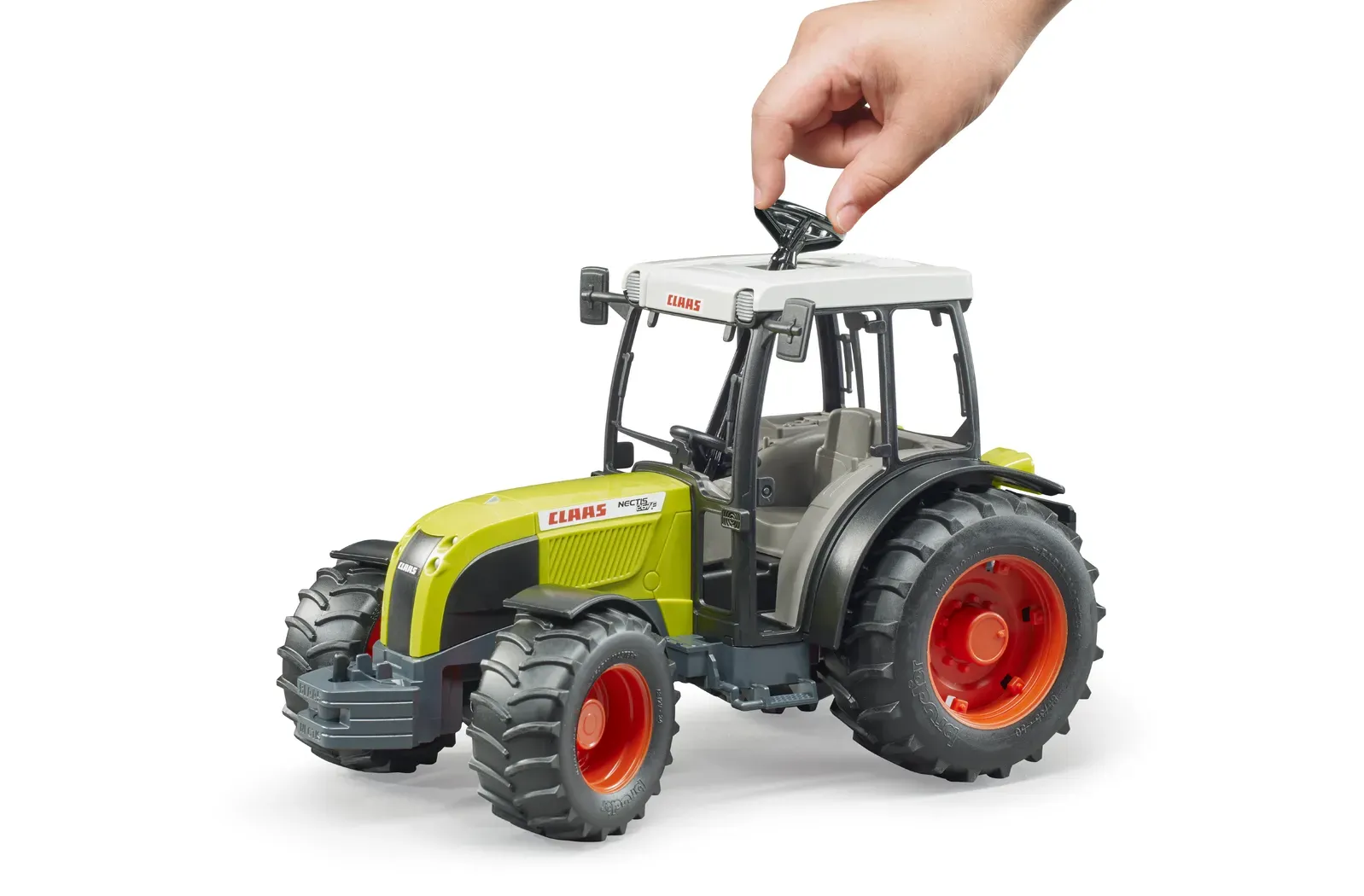 Claas, the farming equipment specialist, has recently started to offer a complete range of tractors. Among its lines of tractors is the Nectis series which is mainly designed for use in vineyards and orchards. Thanks to its powerful engine, its special chassis design and the extreme turning angle of its steering wheel for areas with limited space, this tractor can manoeuvre with ease even in rough terrain. The expansive glazing of the cab means the tractor driver has a clear all-round view. By adding this 1:16 model to its line of toy tractors, BRUDER is rounding off its extremely successful line of Claas products. Of course, this tractor also has the typical BRUDER features and can be combined with all farming equipment available from BRUDER. The model is available in a basic version without front loader [art. no. 02110] and in an extended version with front loader [art. no. 02111]. The front loader [art. no. 02009] can be retrofitted to the small tractors.
