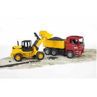 Effective and fast communication between drivers is the prerequisite for work to be carried out as productively as possible. This set includes both the MAN construction truck and a wheeled tractor so that the fun can begin straight away. The sides of the construction truck can be folded down on three sides to unload the transported goods in all three directions. The trough can also be tipped and latched. The articulated road loader FR 130 has a moving front axle and a fully functional bucket arm that can be locked into position. To extend the playing op-tions, the MAN TGA Construction truck can be equipped with the Light and Sound Module (art.-no.: 02801) by simply plugging in the module (not included).