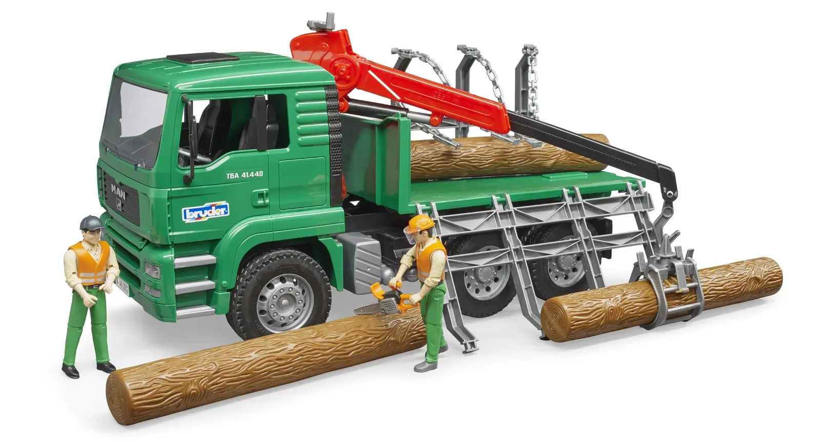 The tipping driver's cab of the MAN timber truck provides a view of the engine block. The wing mirrors of the driver's cab can be folded out and the side walls of the timber lorry can be folded up. The fully functioning loading crane includes a grab that is used for loading and unloading the timber lorry. Three tree trunks are included. Tread tyres complete the picture. To add to the fun of playing, the MAN timber lorry can be equipped with the Light and Sound Module [art. no.: 02801] (not included).