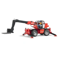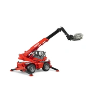 The Manitou MRT 2150 PRIVILEGE telescopic fork-lift truck is a construction machine for universal use on construction sites to take material to nearly any location of the site. Just like the original, the BRUDER model has all sorts of functions. The telescopic arm can be extended and the inclination level of the supplied forks can be adjusted as desired according to the angle of the arm. The lifting forks can also be replaced with a bucket (supplied), or other accessories available from BRUDER to give more functions. The truck can of course be rotated through 360° to distribute the material to all sides. As with the original, stability is ensured by four telescopic supports. The four-wheel steering (small turning radius) is a special feature. The handwheel of the steering control was placed on the rotating structure behind the openable driver?s cab so it can easily be reached during play. The steering movement is transmitted using gears via the slewing ring of the rotating structure to the steering linkage in the chassis ? for toys an innovative solution that increases the fun. This is what makes this model and its many functions a joy for kids to use.