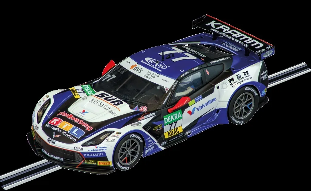 The 1:32 scale Chevrolet Corvette C7 GT3-R "Callaway Competition, No.77" also at home for exciting races around the fast bends of the Carrera race track. The car, which can be individually coded and can therefore be adapted directly to the driver's abilities, is in no way inferior to the big original in terms of racing power. Front, rear and brake lights make the driving experience perfect.