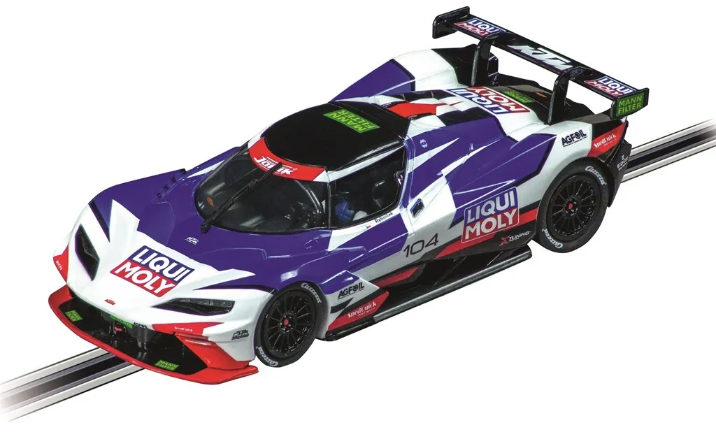 Nothing stands in the way of using the KTM X-BOW GTX "Liqui Moly, No. 104" on your home Carrera racetrack - how well the car masters the track depends solely on your skills with the hand controller. The vehicle can be digitally controlled and individually coded, allowing it to be adapted to the driver's abilities.