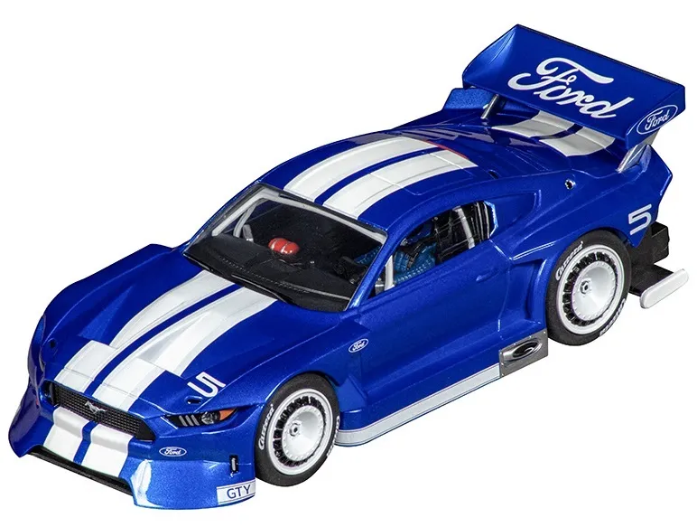 The Ford Mustang has been around since 1964 and is still one of the most iconic sports cars in the world - the 10 millionth Ford Mustang rolled off the production line in Michigan in 2018. The model of the Ford Mustang GTY modified by Carrera with the number 5 was specially optimized for fast drift action on the racetrack and comes in the typical colors of American motorsport in blue and white.