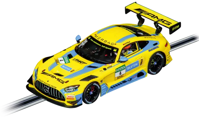 With the Mercedes-AMG GT3 Evo, German driver Luca Stolz achieved sixth place in the overall standings in the 2023 DTM season. It's not just the vehicle's performance that causes a stir, the Mercedes also stands out visually with powerful LED headlights for brilliant track illumination. The distinctive radiator grille and the adjustable front splitter also immediately catch the eye. At home on the Carrera racetrack, the Carrera Mercedes-AMG GT3 Evo "Mercedes-AMG Team HRT, No.4" DTM slot car cuts an equally fine figure thanks to its original license. The model has front and rear lights and can be digitally retrofitted.