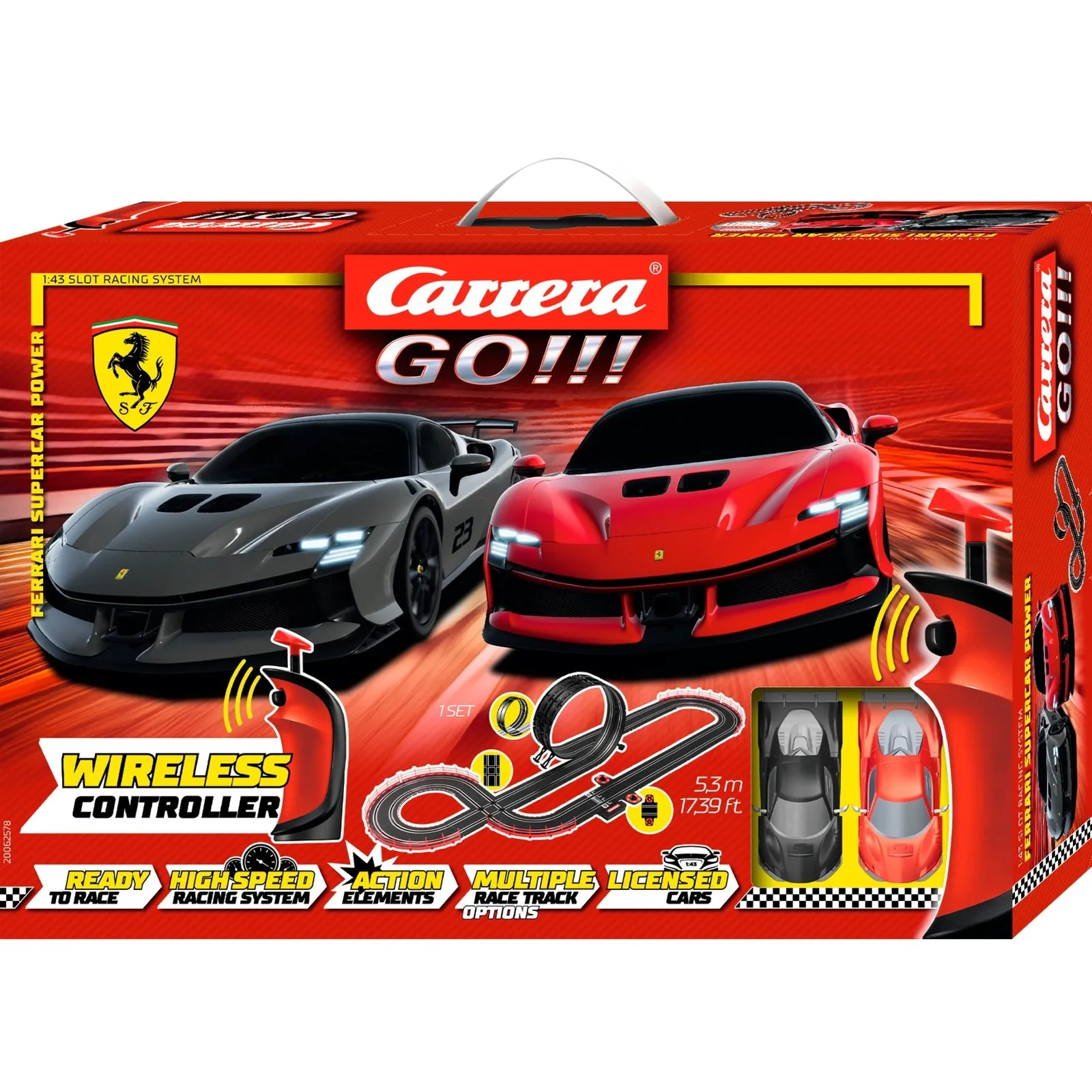 The Carrera GO!!! set "Ferrari Supercar Power" not only offers a racing adventure, but also the opportunity to see the legendary Ferrari cars in action. With the Ferrari SF-90 XX Stradale - Grigio Scuro and Ferrari SF-90 XX Stradale - Rosso Corsa models, racing drivers aged 6 and over can immerse themselves in the world of Ferrari super sports cars. In this set, fans can experience the iconic Ferrari models on a 5.3 meter long, action-packed track. With straights, junctions, loops and more, this set offers an unparalleled racing adventure and thrills in the comfort of your own home. The set includes WIRELESS hand controllers for wireless freedom on the racetrack