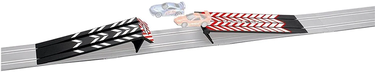 If wild chases on straights and bends aren't enough for you, this ski jump will be a real treat. The jump consists of two parts that are simply placed on the track's rails. Now it's time for you and your vehicle to accelerate properly, aim for the target and drive at full speed up the first part of the jump. Once you reach the top, your car starts to jump and should then land back in the lane of the second part of the jump. Does your opponent have the courage to perform this maneuver or is he too afraid to step on the gas and miss the next section? Prove your courage and talent by increasing the gap between the jump in the next races. The ski jump is suitable for Carrera tracks with a scale of 1:43