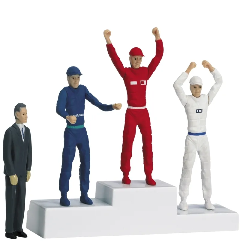 Add an important detail to your Carrera track with the winner's podium and the corresponding figures. A winner's podium is essential for every race and should therefore not be missing on your own race track. The figure set consists of a winner's podium, three winners and an official. The figures are colored and very detailed. This guarantees real attention to detail and the little figures are a real delight. Their body parts can be positioned and rotated in different ways. The figures complete the platform and breathe life into the track. Who can win the most races and reserve the winner's podium for themselves?