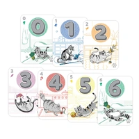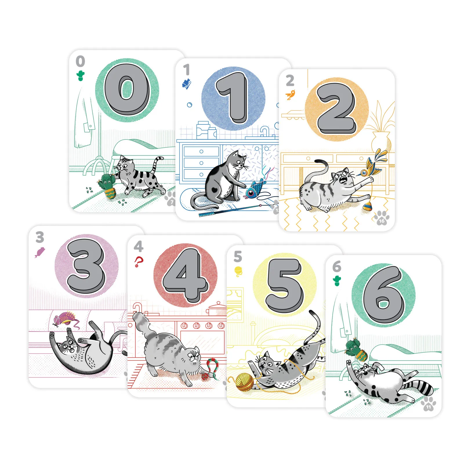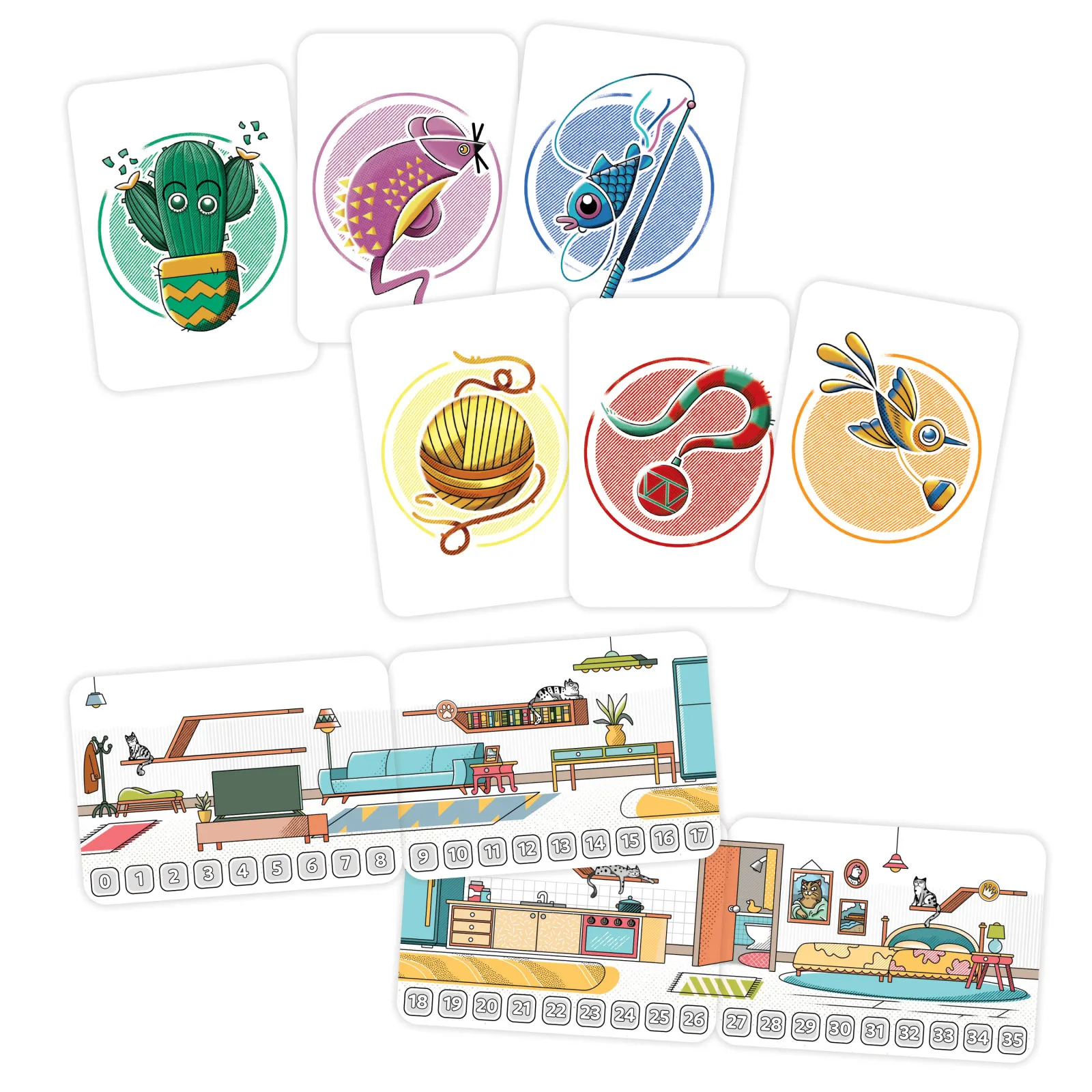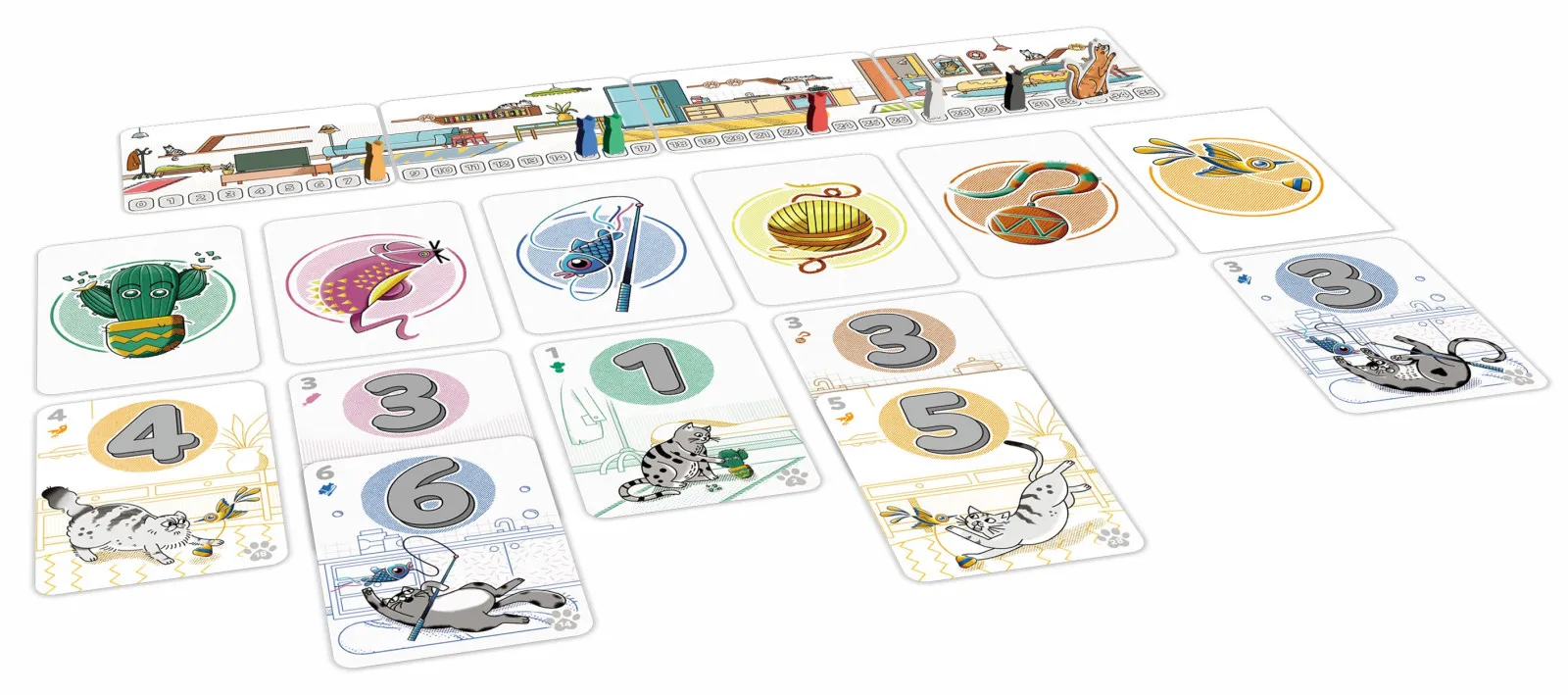 Starting with the player who won the previous round, players take turns playing one card at a time under the six items laid out on the table until each item has two cards below it. The sum of these two cards is the value of this item. Each player sums the value of each item remaining in their hand to determine where they should place their token on the track. Whoever is closest to the cat without passing it has won the round; multiple winners are possible. (If all players have passed the cat, whoever passed it least wins.)