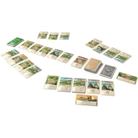 In CATAN – On the Road, gameplay is driven by a deck of 120 cards and builds on well-known CATAN mechanics with a fresh variation. Players gather resources by drawing cards, construct developments from a common set of available choices, and negotiate trades either with the bank or with fellow players. Trading plays an even larger role in this version: any player who trades while it is not their turn is rewarded with an extra resource card.