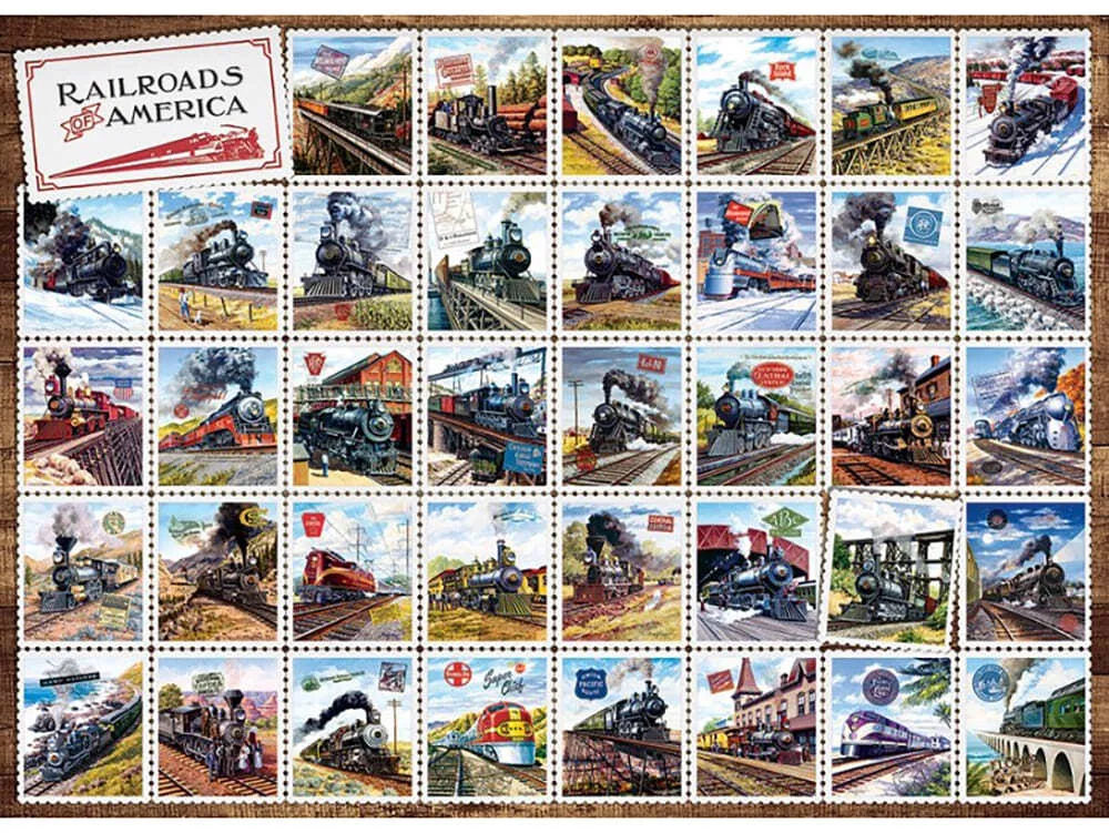 All aboard this Railroads of America 1000 piece puzzle is full steam ahead fun for that train and stamp collector in your life. The great thing about trains is you don't have to be from the place where it comes from to appreciate it. This puzzle is full of spectacular trains that will appeal to any train enthusiast from every part of the world.