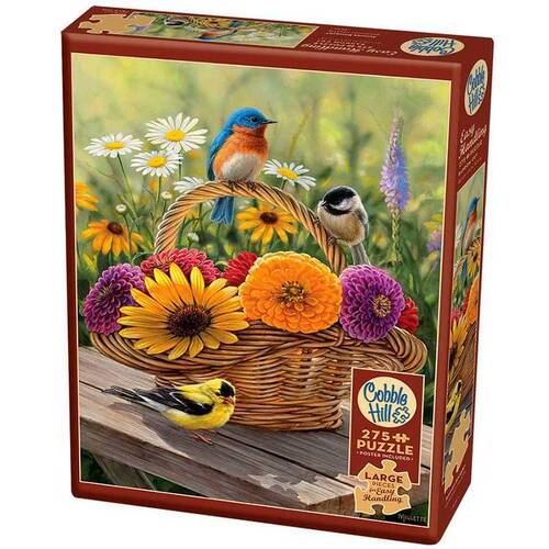 A Summer Bouquet of gorgeous mums and daisies being admired by cute little birds. This has to be the loveliest basket of flowers and birds in beautiful summer colours! Jigsaw by the Cobble Hill Puzzle Company. The company was founded in 2005 with a desire to bring loving, whimsical, high-quality images to puzzle enthusiasts around the world! The puzzles have been described as nostalgic, lively, endearing, sweet, durable, and fine quality.