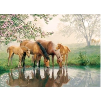 The Horse Family is having a drink of water by their favorite tree near the pond on this misty afternoon in the pasture. Family Pieces 350 puzzles include three different piece sizes so puzzlers of all skill levels can collaborate. The large pieces are on one end of the puzzle, the medium in the middle, and the small pieces on the other end. While these puzzles are designed for families, don't let that stop you from enjoying it on your own! It's also a great option for newer puzzlers who want to step up from a 275 piece puzzle, but not ready to jump into a 500 or 1000 piece. As well, skilled puzzlers enjoy this piece count when they need a little "snack" break.