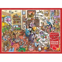 There is nothing like the chaos of Thanksgiving Togetherness. No need to embellish your post-Thanksgiving story when you have a crazy cousin or uninterested unkle to keep things interesting. This story tells more than just the turkey day football game or Grandpa carving up the turkey - you're in for 1000 pieces of pure cartoon fun as you discover the dogs, cats, and rats having their own party, while the kids outside try and catch a flying pig, huh? Meanwhile, nobody notices little Joey giving his dinner to the dog or the live turkey hanging out in a sweater in your living room! Just good ol' fashion fun in this Doodletown puzzle.