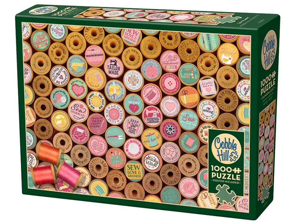 Sew Happy is a sea of spools with a top down view. These wood spools have different sayings from Keep Calm Get the Seam Ripper, Sew Love and Kindness, Cute as a Button, and so many more clever quips. Cobble Hill was founded in 2005 with a desire to bring loving, whimsical, high-quality images to puzzle enthusiasts around the world! Our puzzles have been described as nostalgic, lively, endearing, sweet, durable, and fine quality.