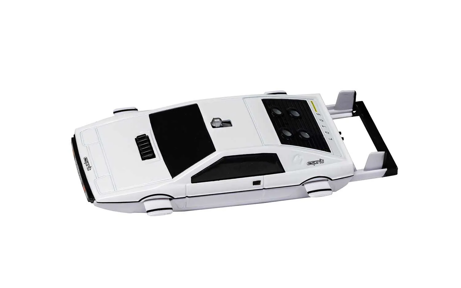 The submersible Lotus Espirit was realised onscreen in ‘The Spy Who Loved Me’ through both miniature special effects photography and the construction of a full size operational incarnation, built by Florida based marine engineers. The submarine was formed from an Espirit body shell supplied by Lotus, with the addition of four propellor units, ballast tanks and power provided by batteries sealed in a water-tight compartment. During filming in the crystal-clear waters of the Bahamas, the craft was operated from within by a former Navy SEAL dressed in full scuba diving gear.